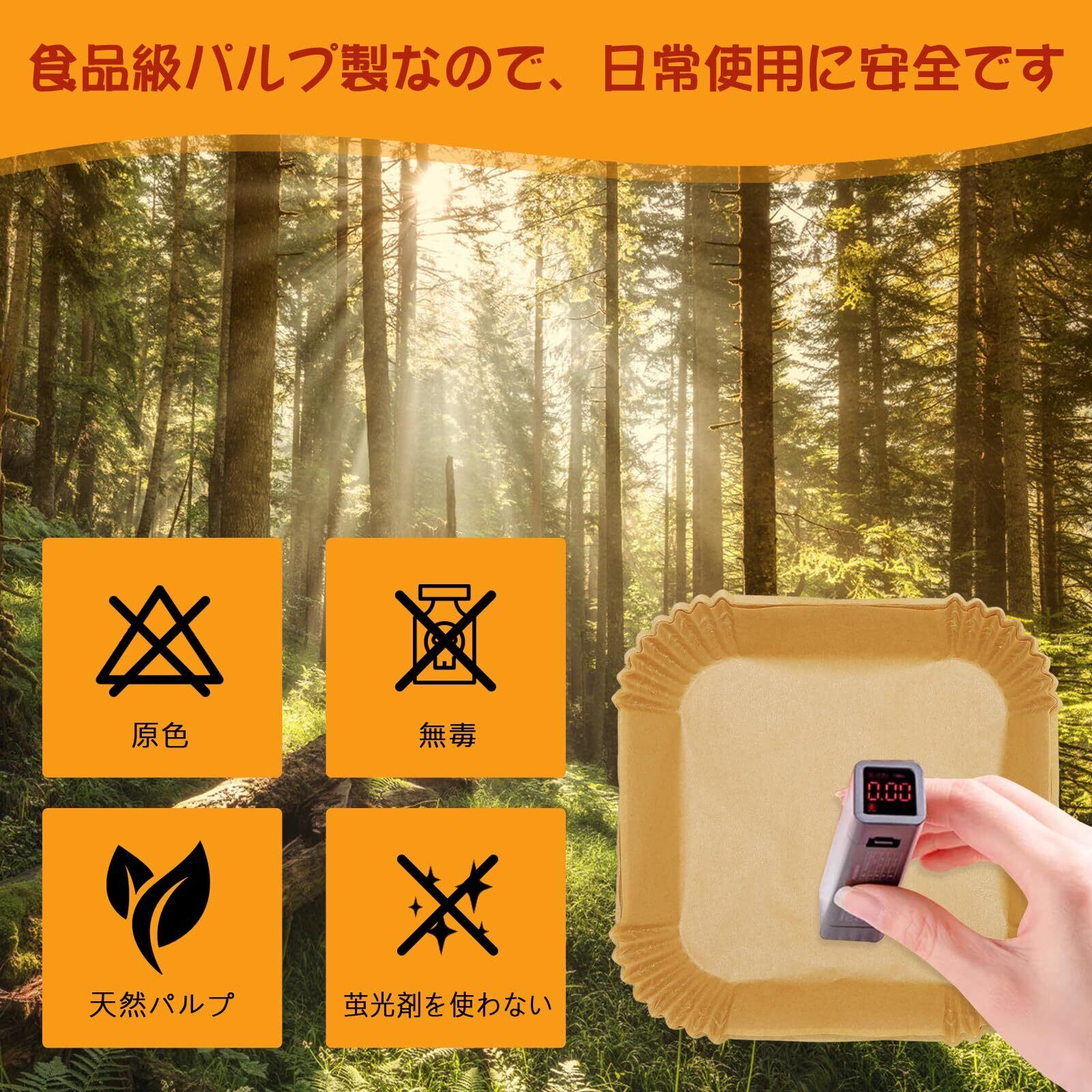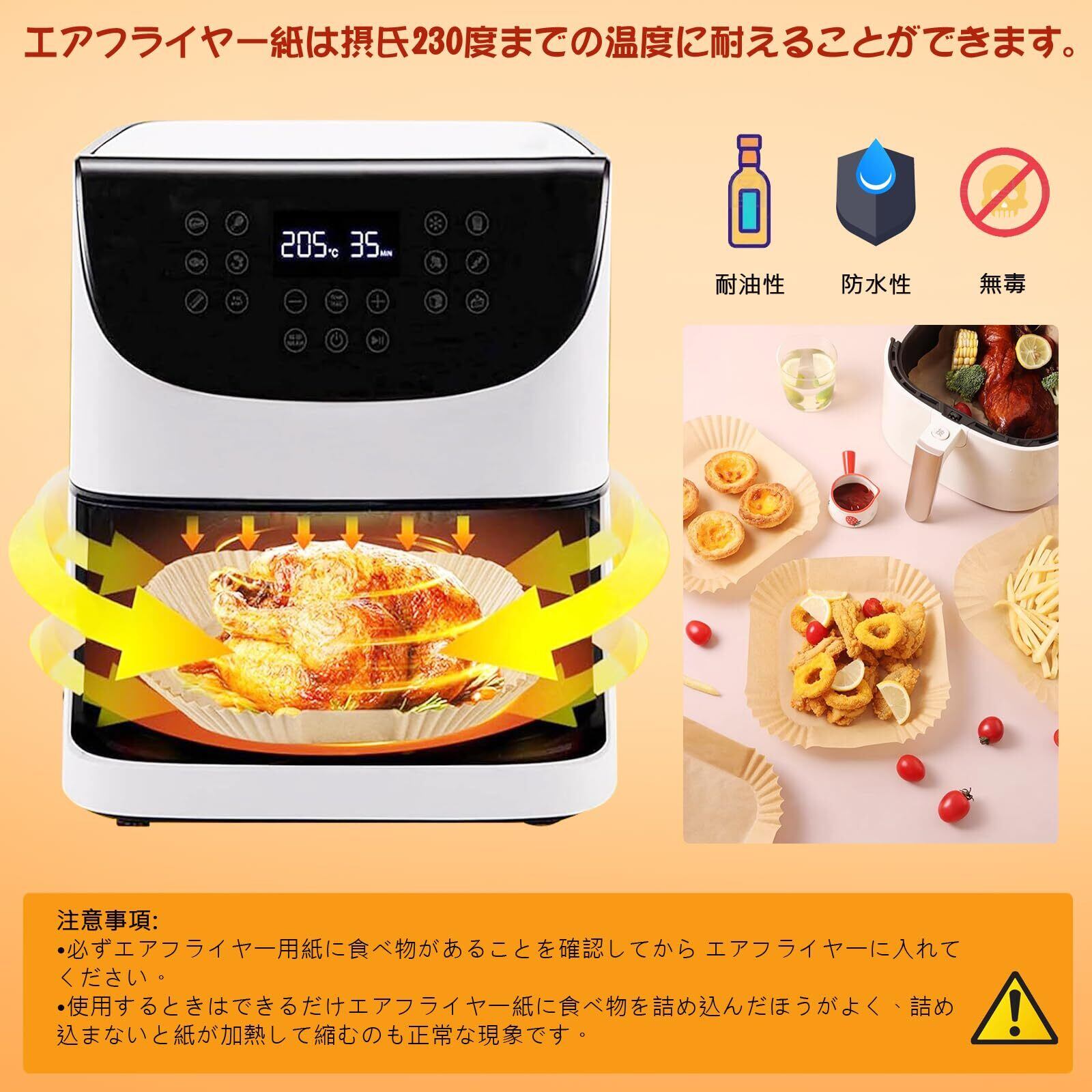 1.【高品質素材、防水・防油・耐熱】●エアフライヤー専用ベーキングシートは食品グレードのシリコンオイル紙を採用。素材は食品接触用パルプ●防水・防油・非粘着性を備え、汁や油の浸透を効果的に遮断し、食品残留汚れを防止。耐熱温度220℃で食材の風味を損なわず、あらゆる調理シーンに対応。高密度素材設計により、同類のエアフライヤー用ベーキングペーパーよりも優れた耐裂性を実現。