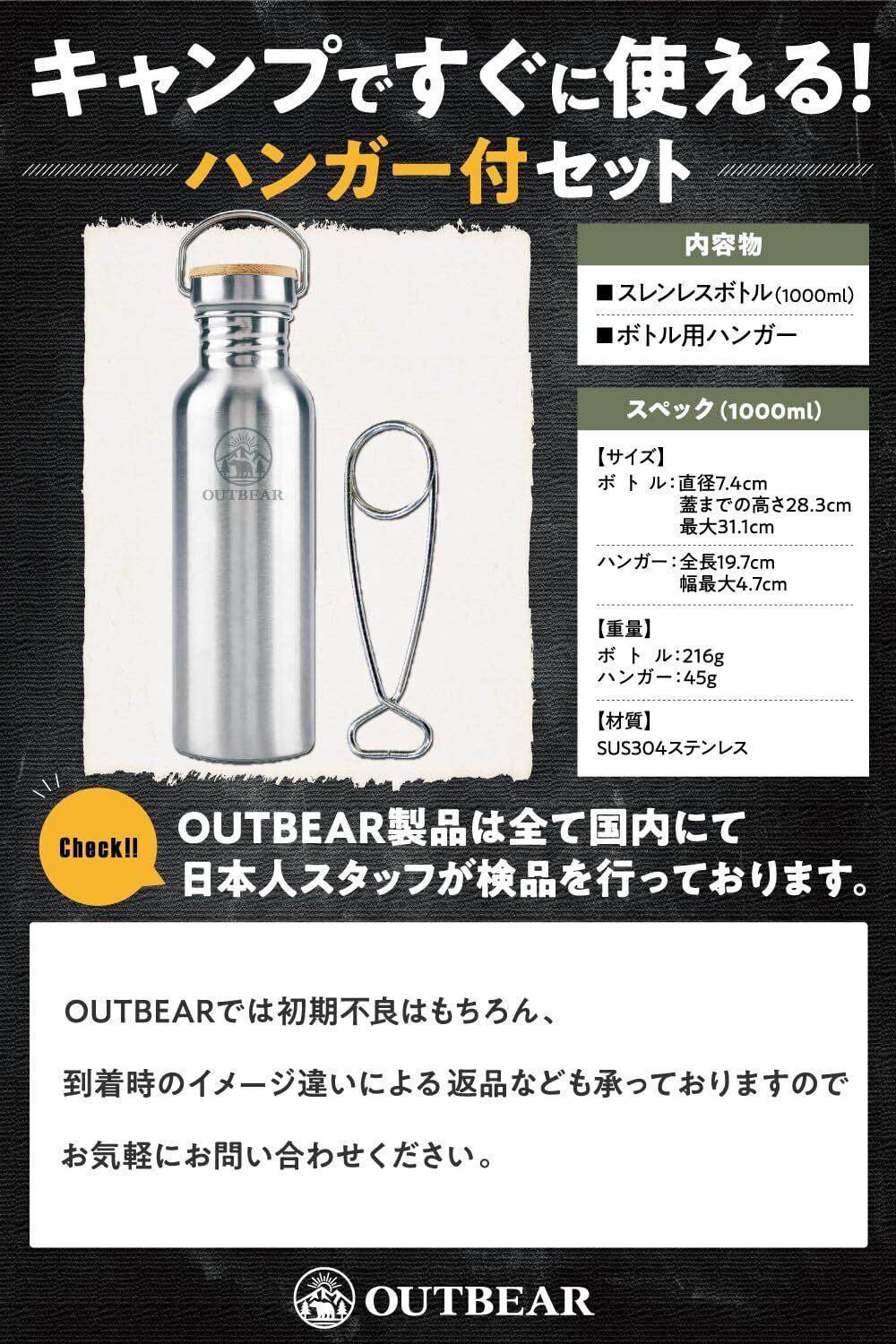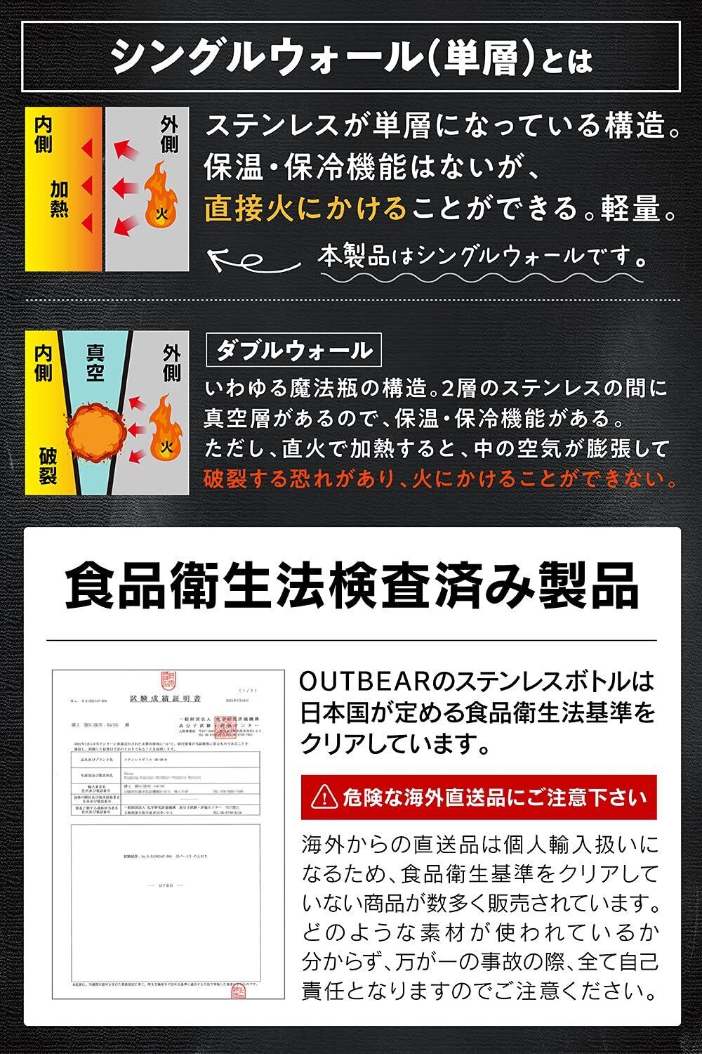 【安全性】日本国が定める食品衛生法検査済み製品です。材質:ステンレス SUS304を使用。世界で最も使われているステンレスの一種であり、錆びにくく、耐久性があります。OUTBEAR(アウトベアー)製品は日本企業が企画開発・検品・販売・サポートを行なっております。購入後30日間の返品可能です。購入後の不明点や不良など、すぐに対応します。
