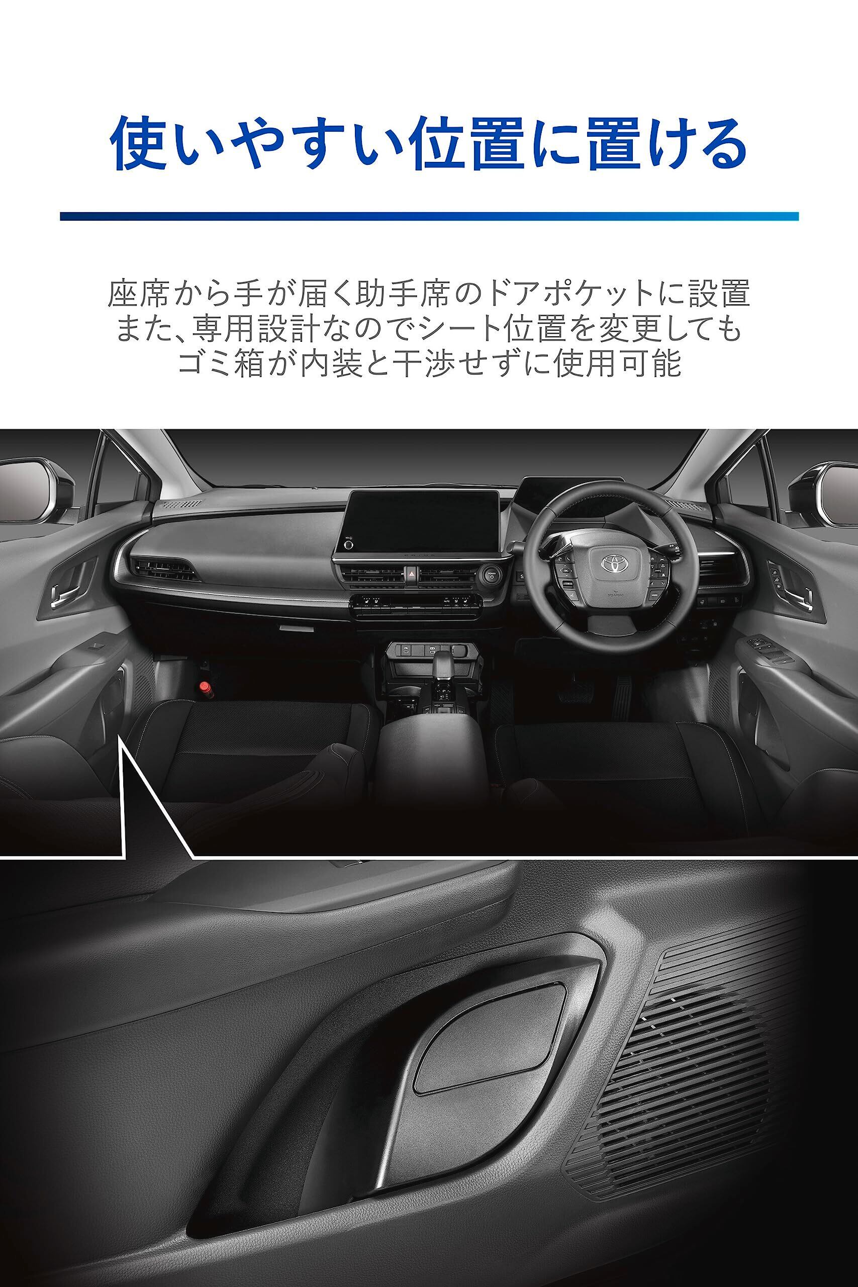 ●ぴったり収まる専用設計 プリウス専用設計のためドアポケットにぴったり収まります。専用設計のため、シートの位置を変更してもゴミ箱とシートが干渉しません。