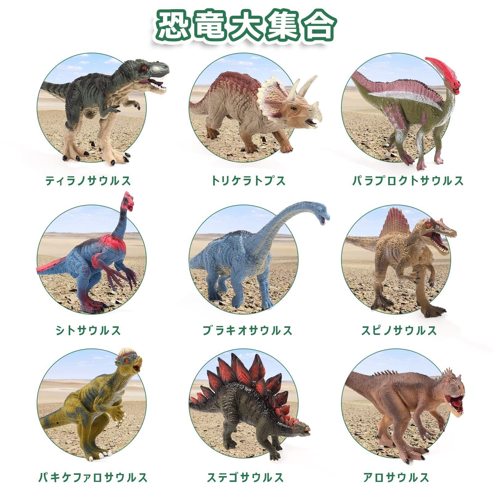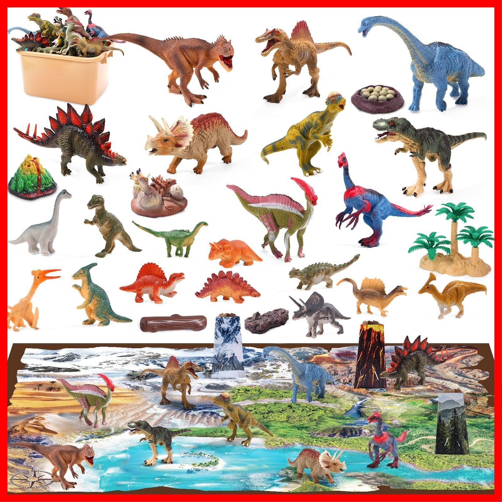 【40点セット内容】大きな恐竜フィギュア9セット(ティラノサウルス、トリケラトプス、パラプロクトサウルス、シトサウルス、ブラキオサウルス、スピノサウルス、パキケファロサウルス、ステゴサウルス、アロサウルス )、ミニ恐竜12セット、大きなプレイマット、火山、木、恐竜の卵、石、3シーンシミュレーション段ボール、収納ボックスが付属していますので、子供たちが恐竜の冒険を始めるのに役立ちます!