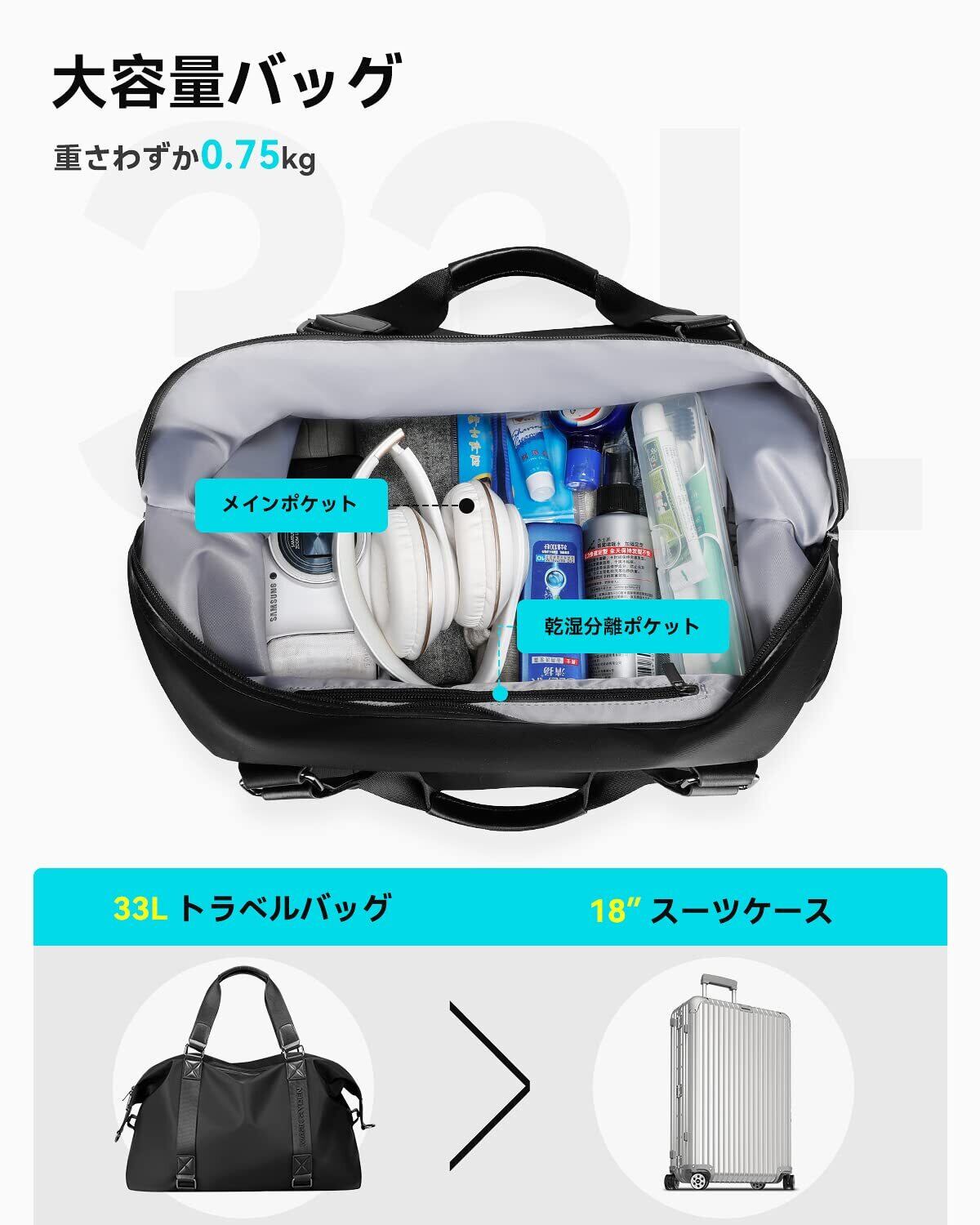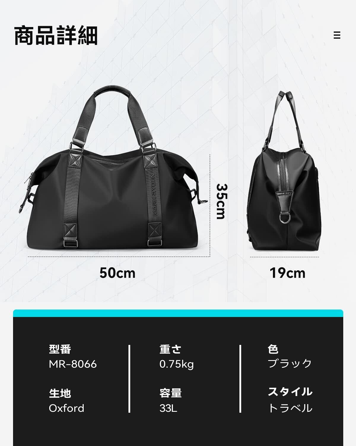 ▶【規格】:本製品はMARK RYDEN(マークライデン)の品番MR8066 実用的なボストンバックですね。。サイズ:50 cm*35 cm*19 cm、33 L容量で、18インチレバーボックスよりも容量が大きい。普段のフィットネスや3 ~ 5日の旅行や出張にも適しており、飛行機は簡単に搭乗でき、託送する必要はありません。わずか0.75 kg、非常に軽量2種類の背負い方があり、手で持つことができ、片肩で背負うことができます。