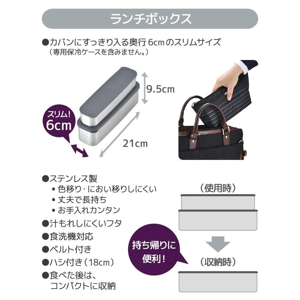 素材・材質:上容器本体/ステンレス鋼、下容器本体/ステンレス鋼、上フタ/ポリプロピレン、下フタ/ポリプロピレン、ハシカバー/ポリプロピレン、上フタパッキン/シリコーンゴム、下フタパッキン/シリコーンゴム、ハシ/飽和ポリエステル樹脂