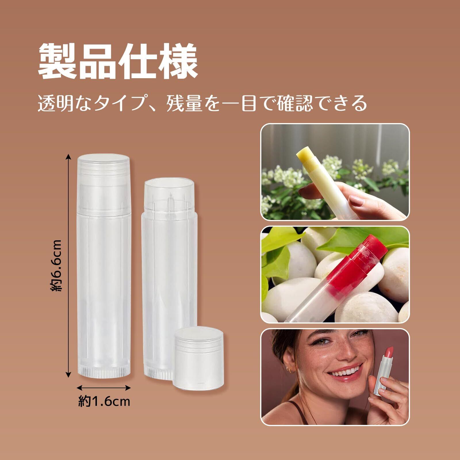 【透明なタイプ】透明なタイプのチューブがあり、使用中の製品の残量を一目で確認できるため、非常に便利です。可視性は、ユーザーがいつリップクリームを補充する必要があるかを把握するのに役立ちます。さらに、透明なチューブは製品の外観も美しく見せてくれます。チューブの形状やデザインによっても個性を出すことができます。