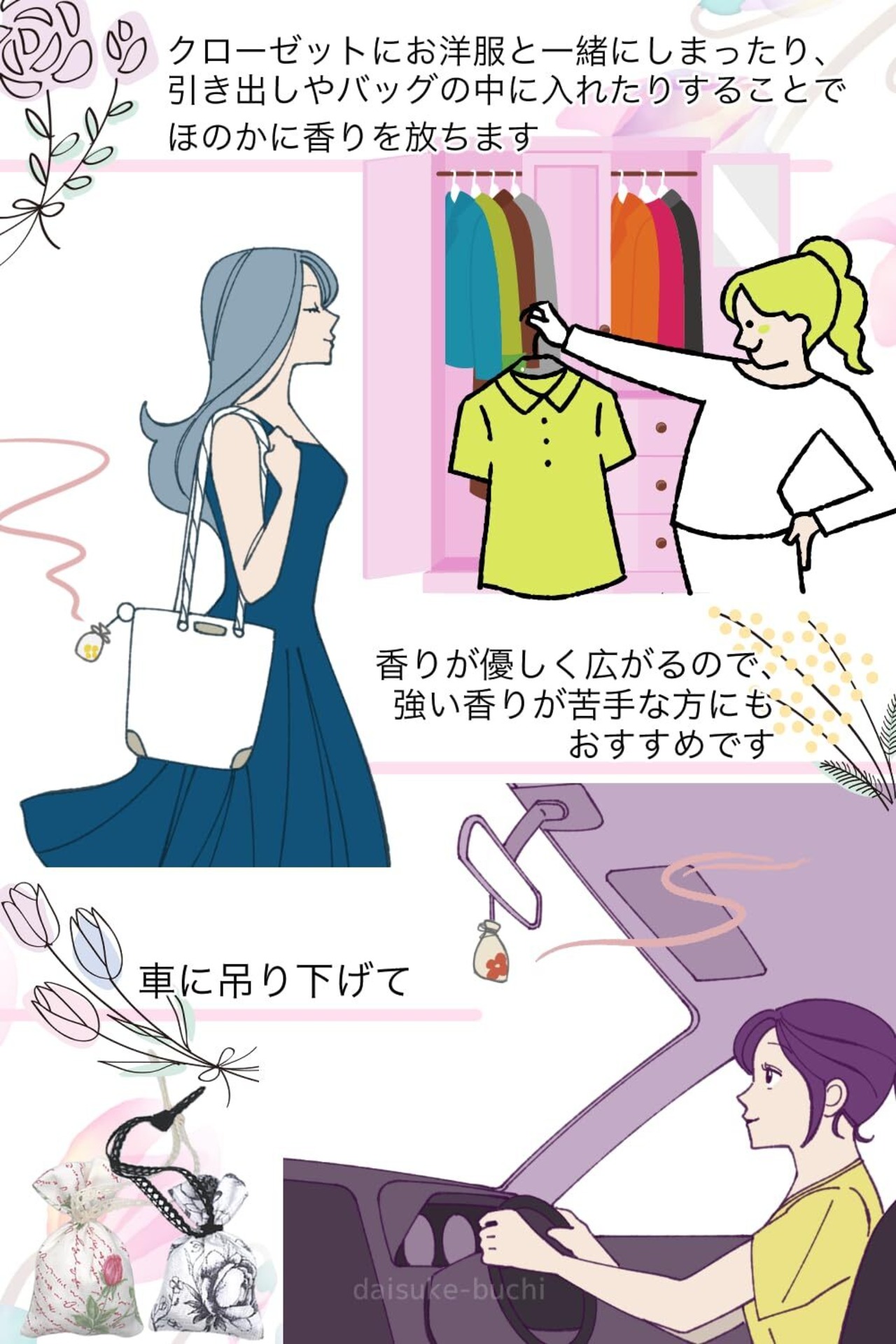 ◆使い方 香りを拡散する効果はありませんので狭い空間で使用するのがおすすめです。 クローゼットにお洋服と一緒にしまったり、カバンの中に入れたり、車のミラーに吊り下げたりすることで上品な香りを放ってくれます。