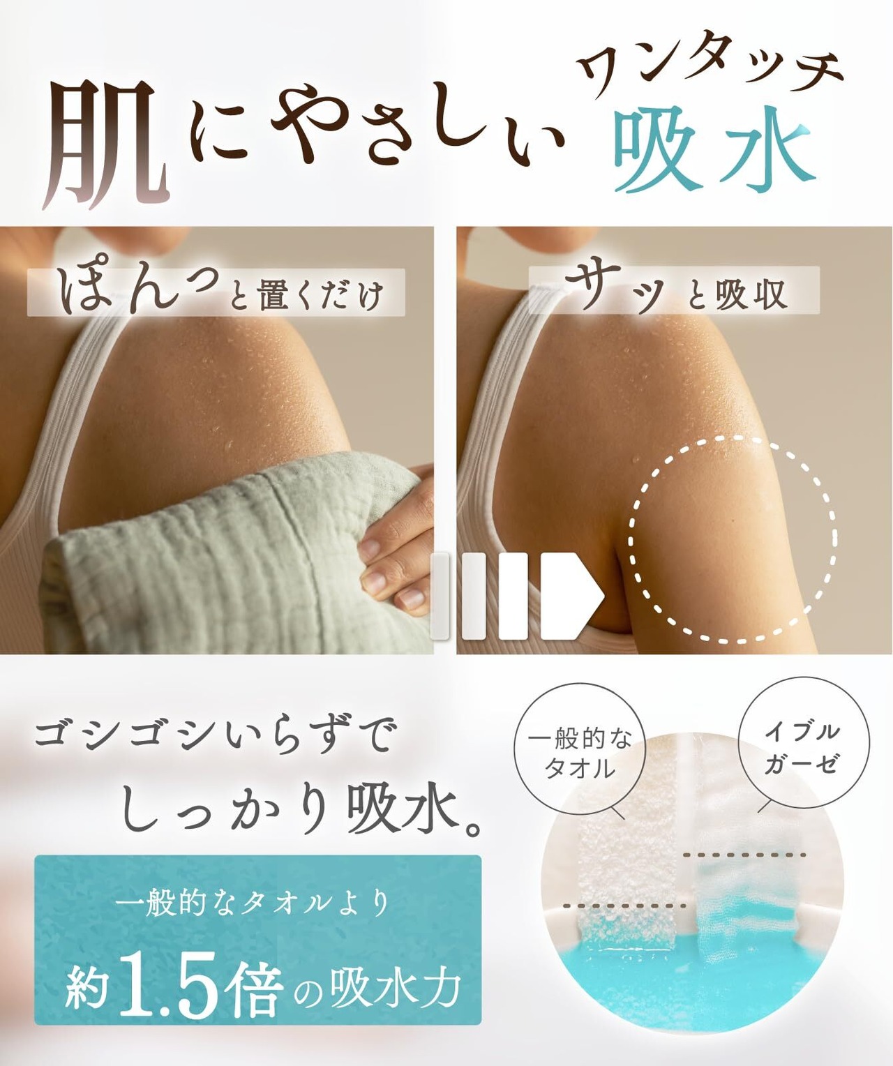 【押さえるだけでOK】 タオルでゴシゴシ拭くことが、肌の負担になってるな…と感じたことはありませんか?イブルガーゼは、肌にそっと当てるだけで水分を受け止める“押さえ拭き”向きのタオル。ゴシゴシ拭く爽快感を重視したい方には向きませんが、肌への刺激を減らしたい方には心地よく使っていただけます。