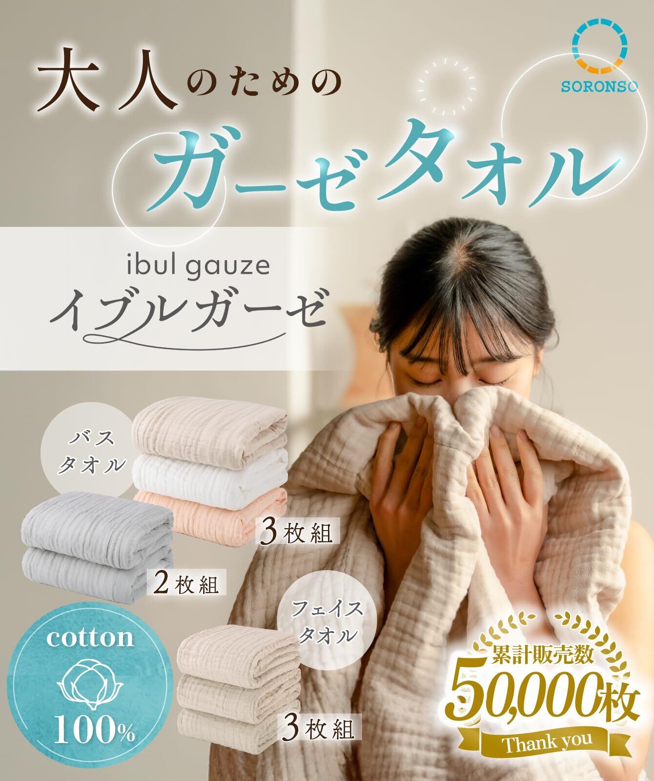 【肌をいたわる、ガーゼタオル】 赤ちゃん向けのガーゼは多いのに、大人のためのガーゼタオルが少ないのはどうしてだろう…。そんな想いから生まれたのが、ソロンソのイブルガーゼ。コットン100%のやさしい肌あたりで、こすらず使えるのが最大の魅力です。「肌へのやさしさ」を大切にしたい方をはじめ、数多くの方に選ばれています。
