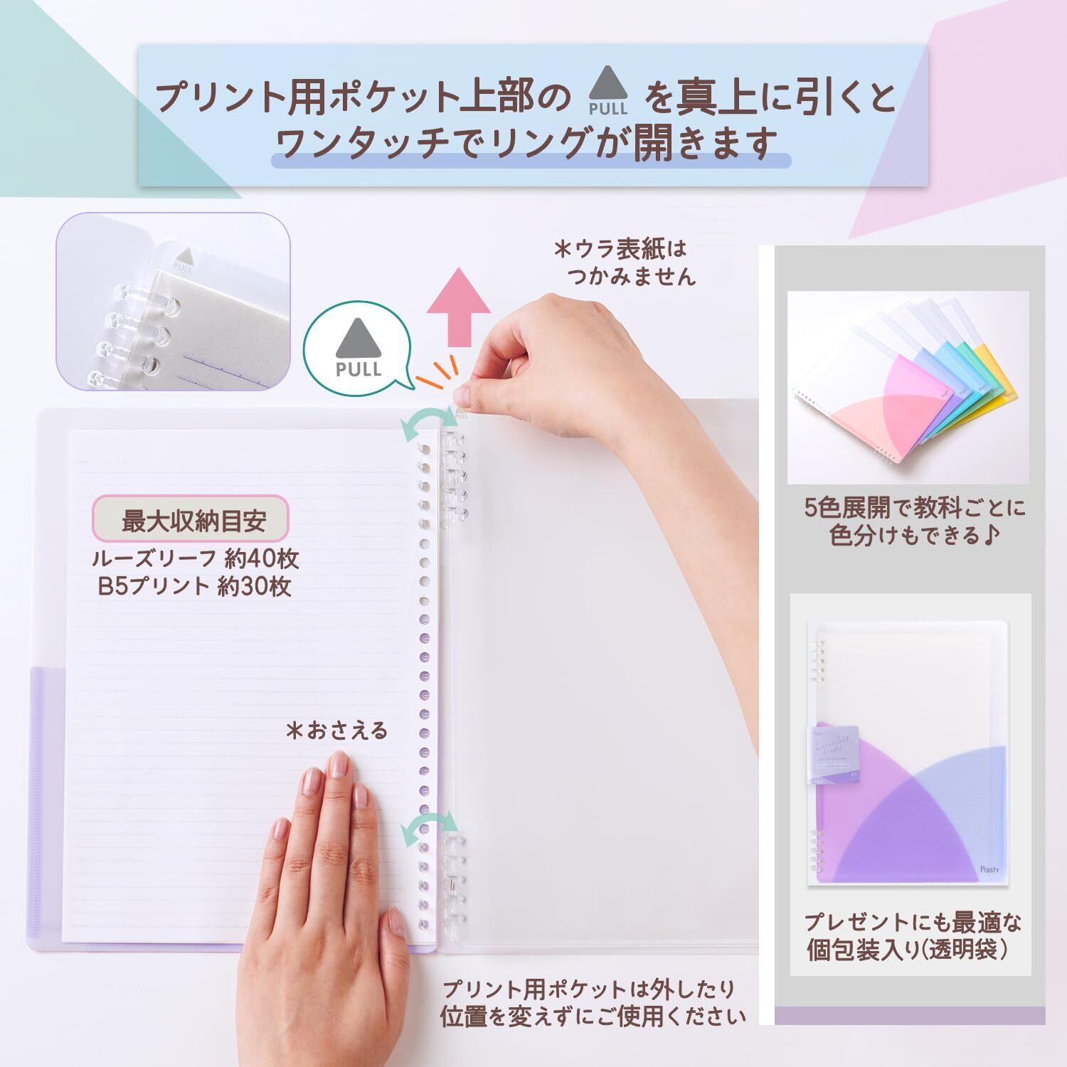折り返せるリング式のルーズリーフバインダー。プリントを無くさないプリント用ポケット付き