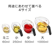 傾斜のついた内側の目盛りを上から見るだけで、簡単に計量できる