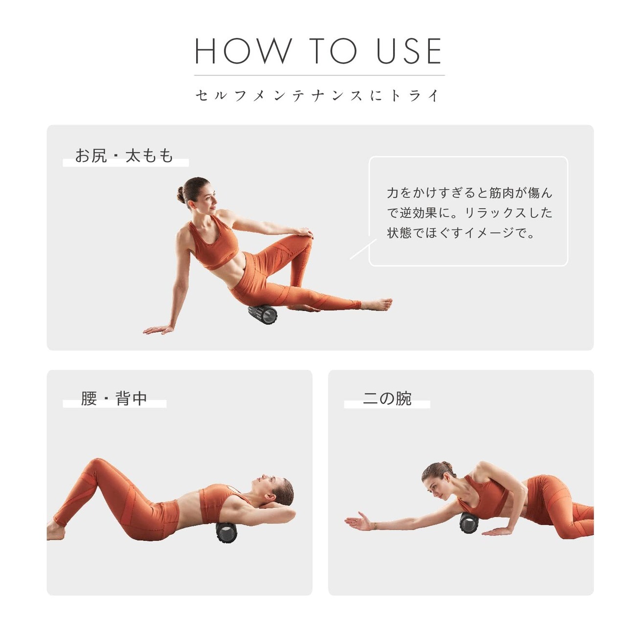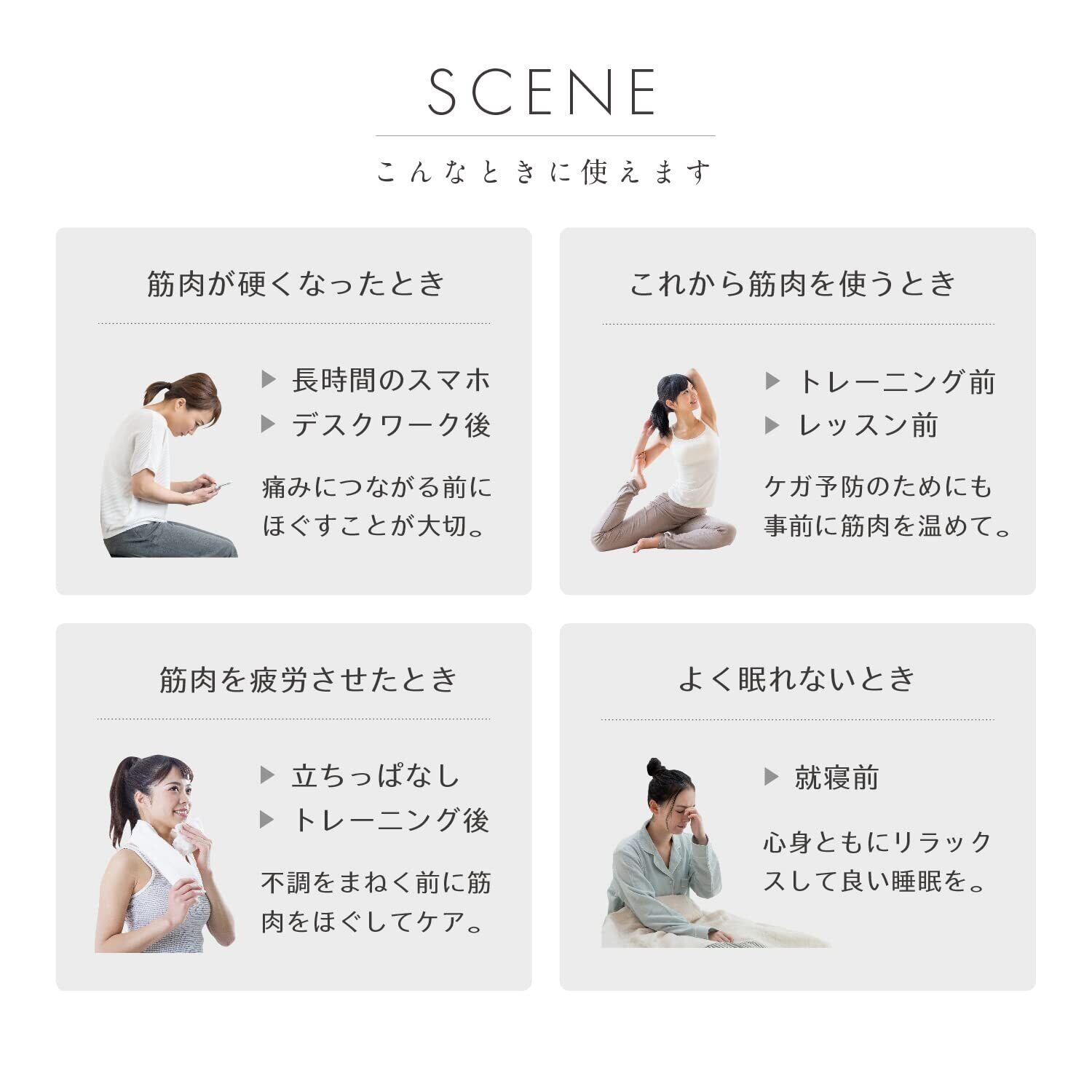 【こんなときに】長時間のスマホやデスクワークで、筋肉が硬くなったとき/トレーニング前などケガを予防したいとき/トレーニングや運動後など、筋肉を使ったあと/睡眠前にリラックスしたいときなどに