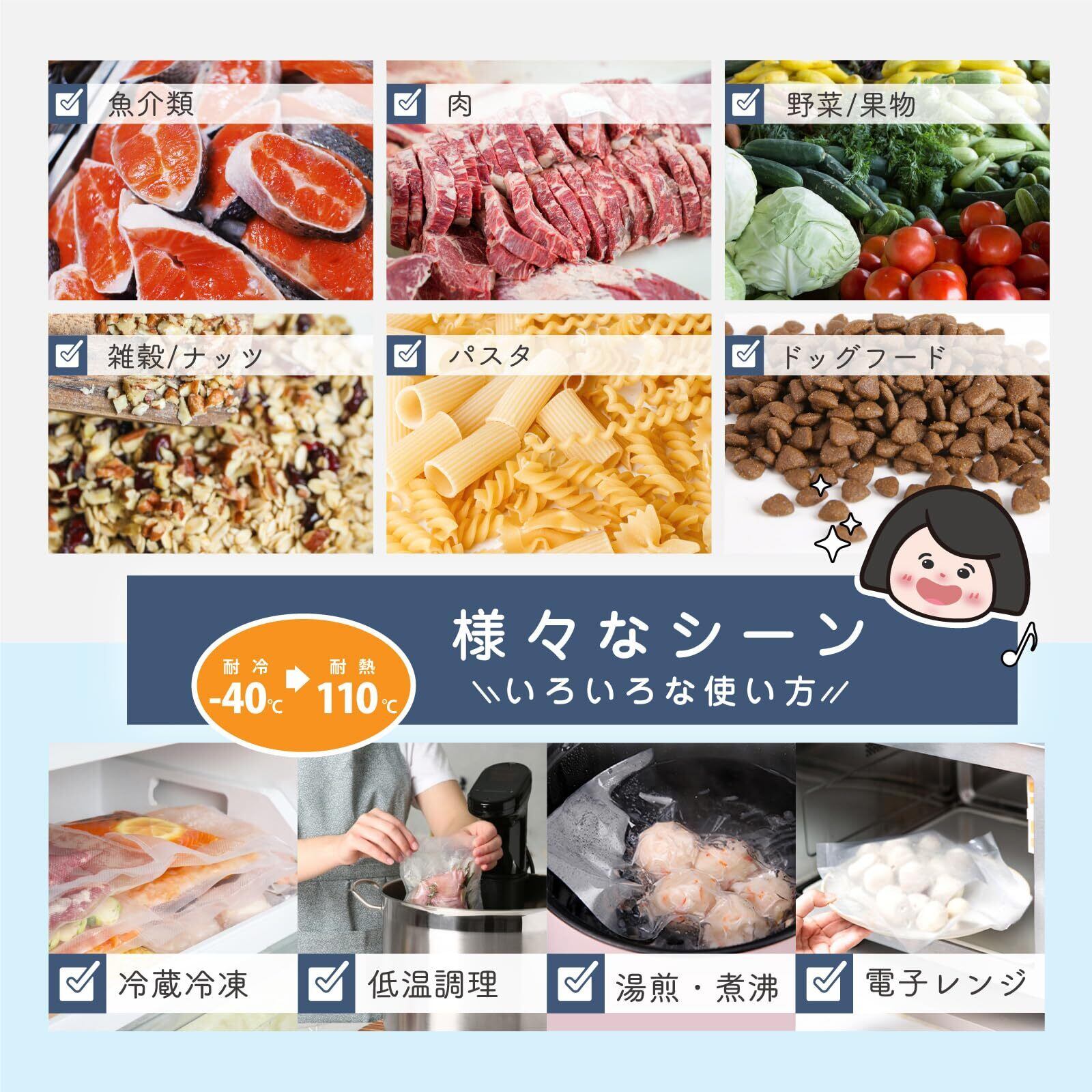 安心の素材:真空パックは生産中に接着剤を使用せず、BPAフリー(BPAを含まない)食品級のPA材料とPE材料を採用して、SGSのFDA認証も取得します。環境に優しいし、非毒性で匂いもしなく、ご家族の健康を守ります。