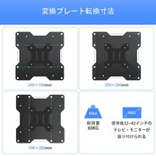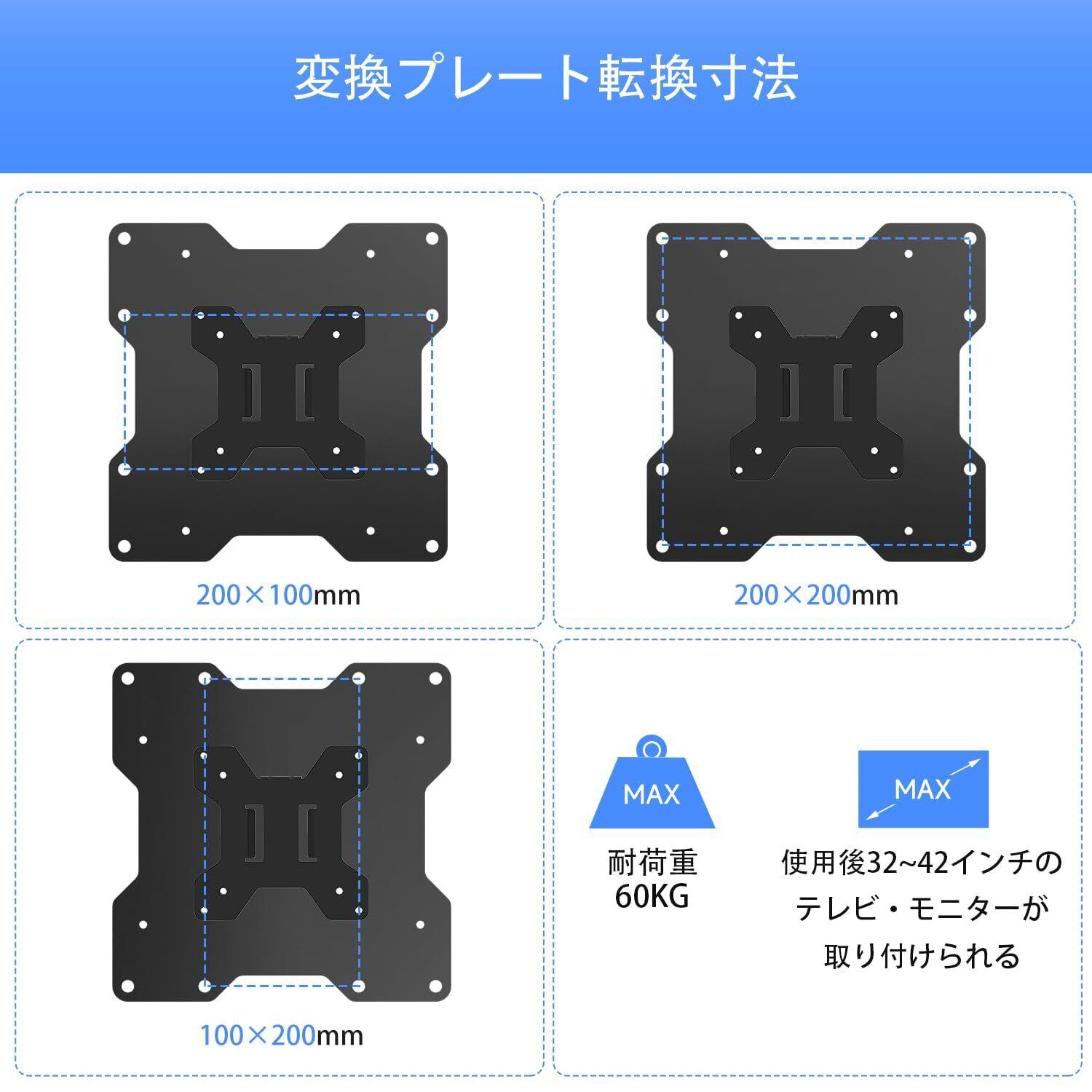 【VESA変換プレート規格】50X50mm、75X75mm、100X100mmから100X200mm、200X100mm、200X200mmまでのVESA規格に転換できます。▶モニターアーム、テレビ壁掛け金具に適します。▶対応サイズ:32~42インチ▶耐荷重:60KG