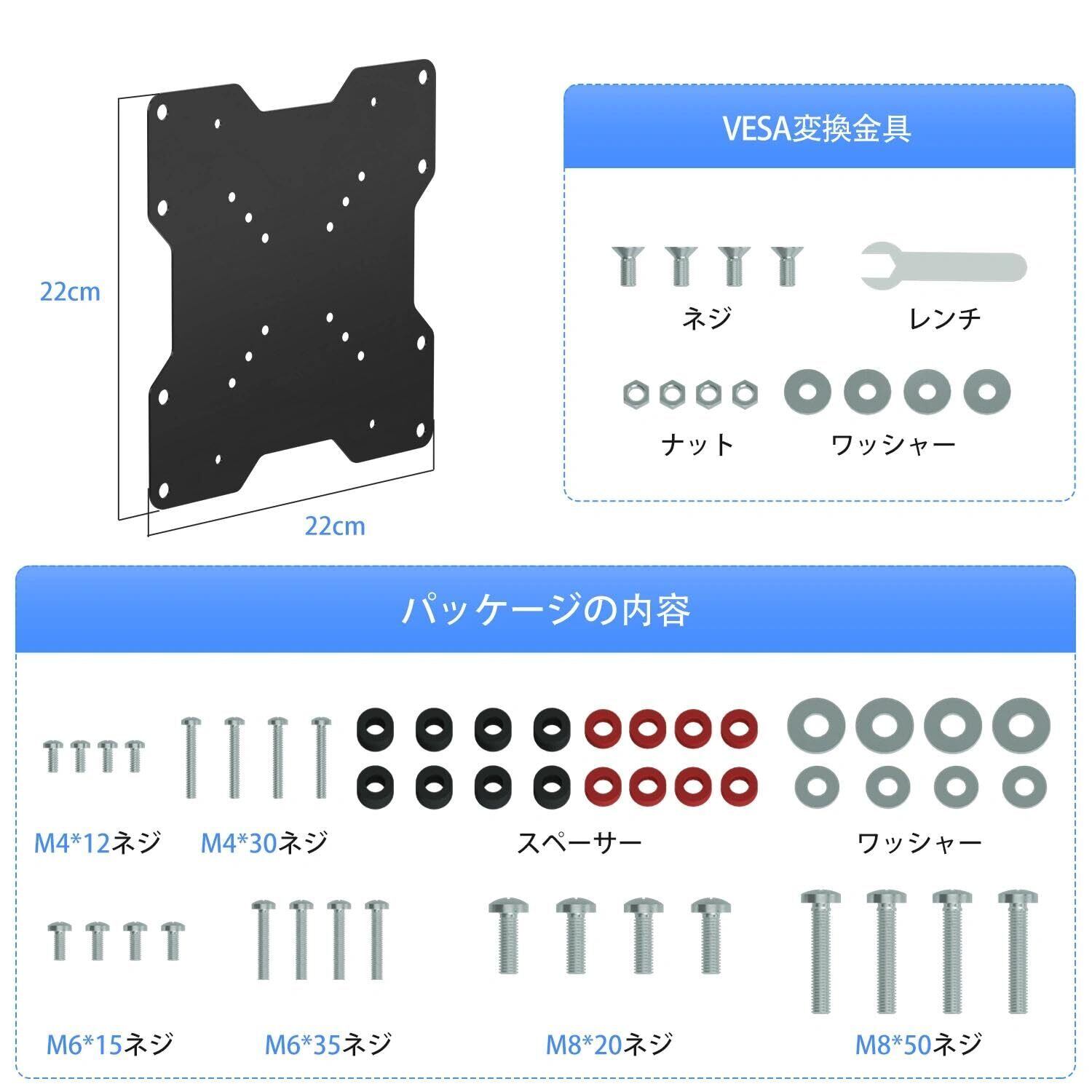 【梱包リスト】VESA変換プレート×1、M4*10ネジ(4本)、M4ナット(4個)、ワッシャーD4(8枚)、レンチ(1本)、M4*12ネジ(4本)、M4*30ネジ(4本)、M8*20ネジ(4本)、M8*50ネジ(4本)、M6*15ネジ(4本)、M6*30ネジ(4本)、ワッシャーD6(4枚)、スペーサーD8*10(8本)、スペーサーD8*5(8本)、日本語取付説明書(1部)。※ご注意:①この変換プレートはVESA規格50X50mm、75X75mm、100X100mmのVESAプレートだけ対応出来ます。②購入前にモニターの配線スペースを影響かどうかを確認してください。③M4、M6、M8ネジのサイズをご確認した上で、テレビやモニターに設置してください。④M4、M6、M8ネジのサイズに合わなかったら、組立できかねます。