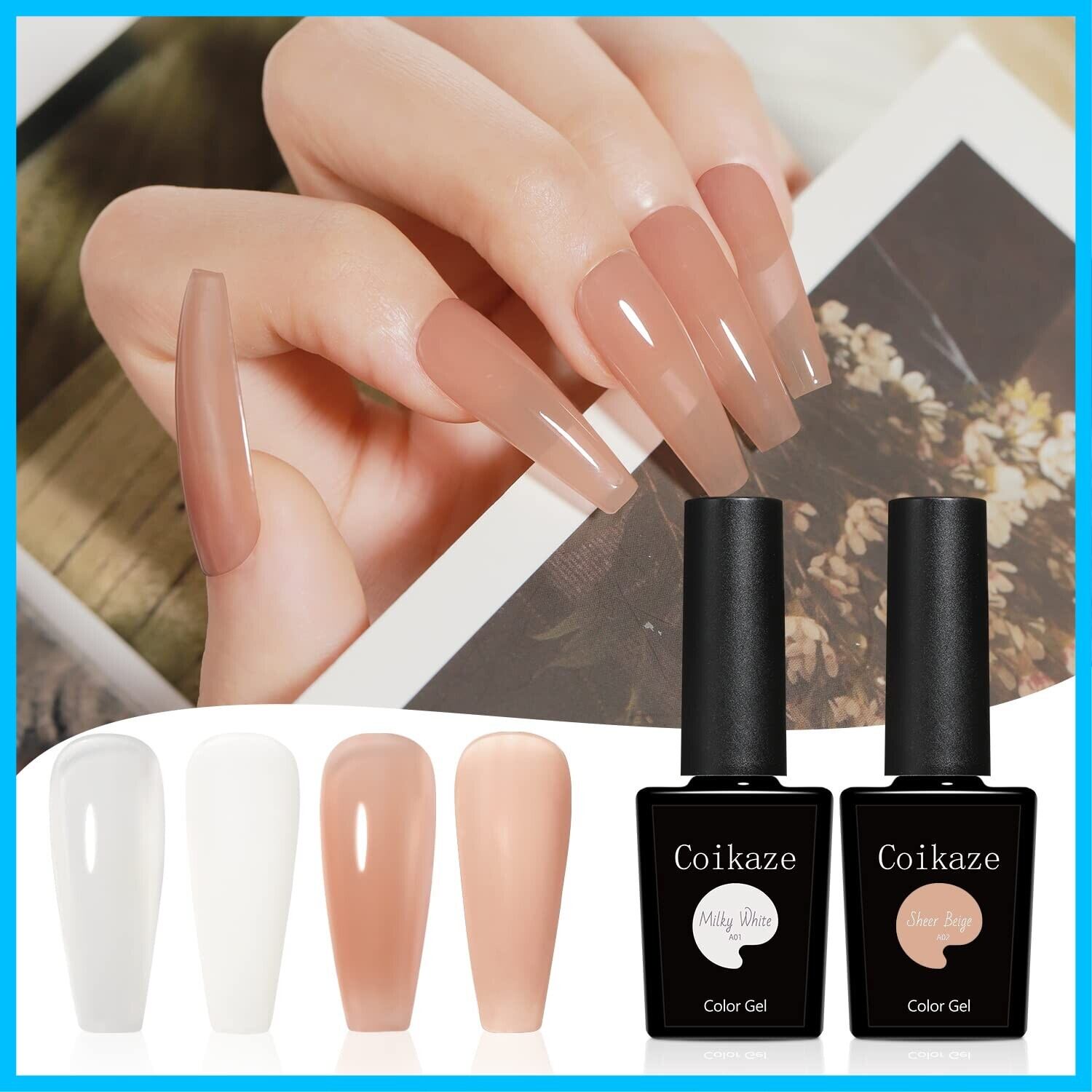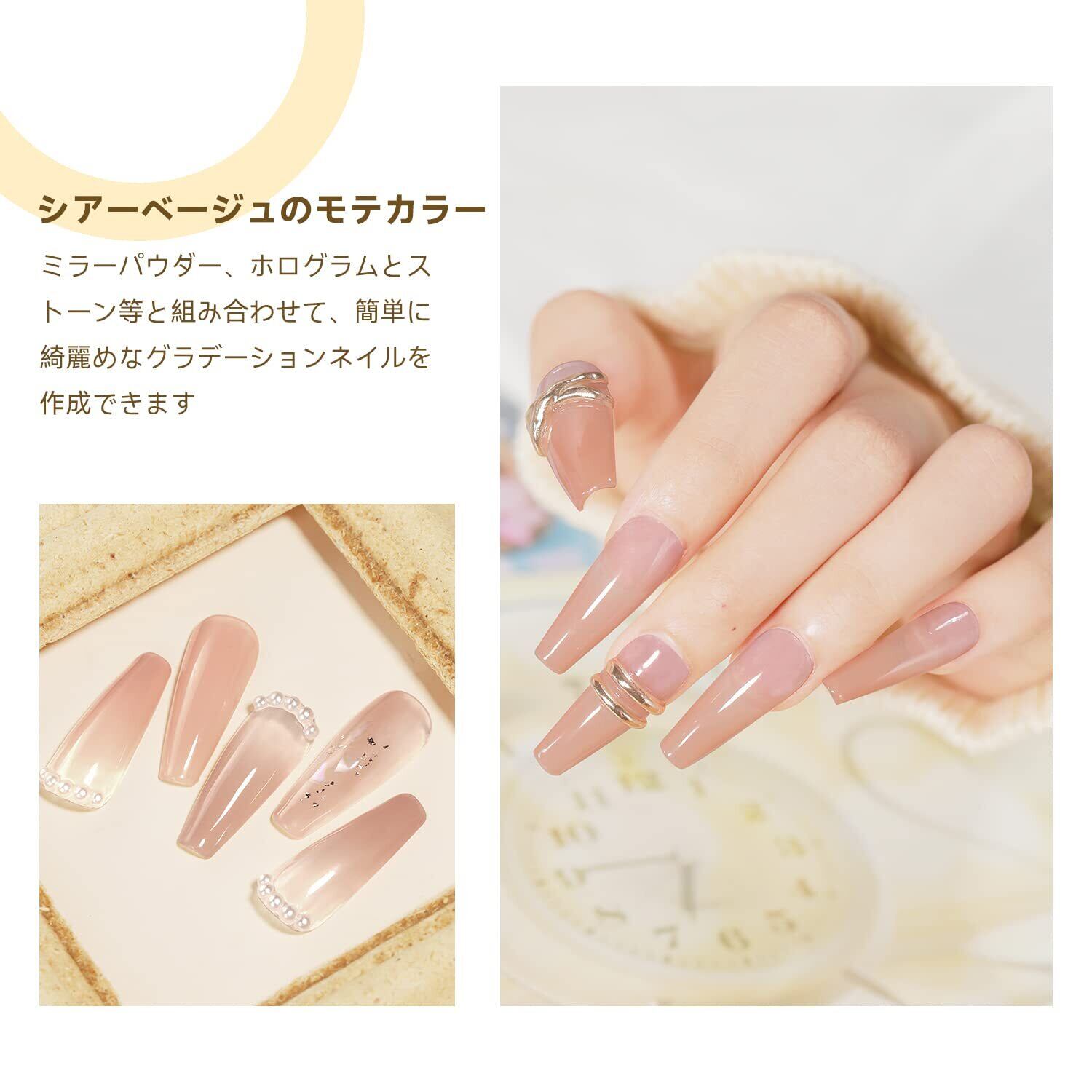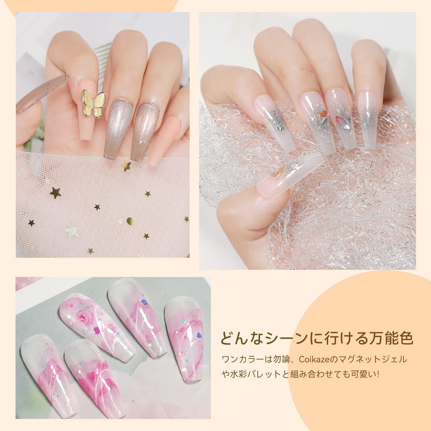 【素敵なモテカラー】ミルキーホワイトとシアーベージュのモテカラーセットで、どんなシーンに行ける万能色。透き通る優しいミルキーホワイトはCoikazeの水彩パレットやマグネットジェル等と組み合わせて素敵な指先を演出します。シアーベージュはミラーパウダー、ホログラムとストーン等と組み合わせて、簡単に綺麗めなグラデーションネイルを作成できます。