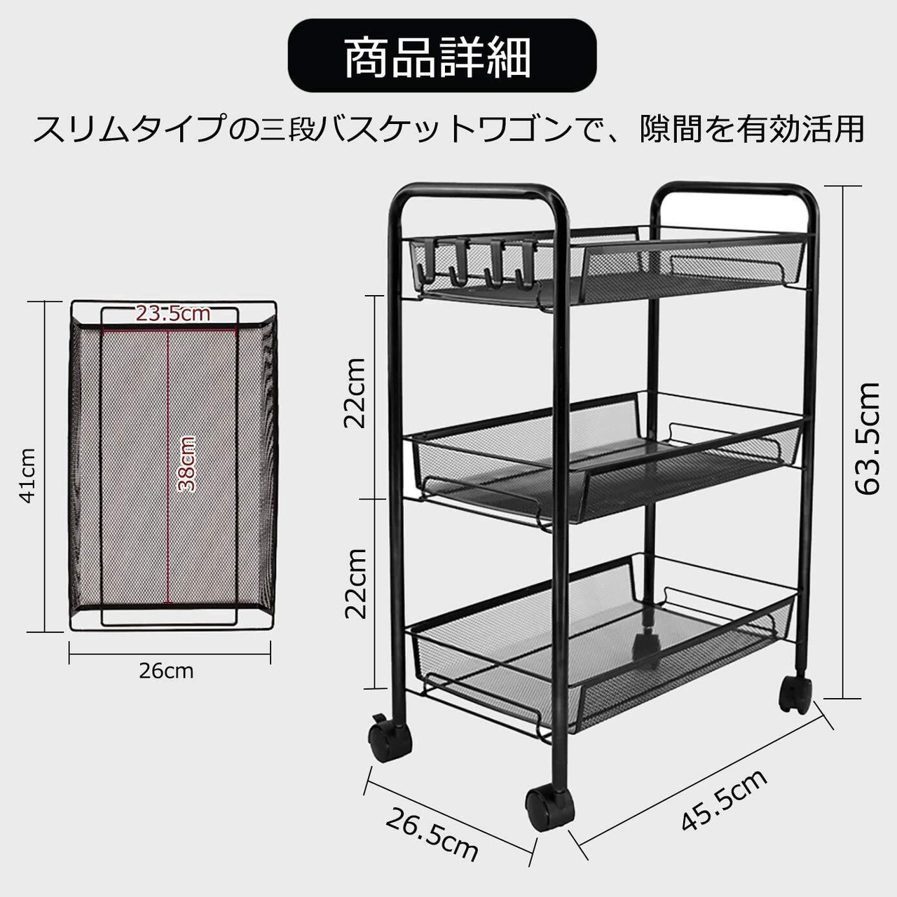 【商品詳細】本体サイズ:幅26.5×奥行45.5×高さ63.5cm 重量(約):2.35Kg 耐荷重(約):45kg(一つあたり15kg)バスケット間口:幅26 奥行41cm バスケット内寸:幅23.5 奥行38 高さ6cm