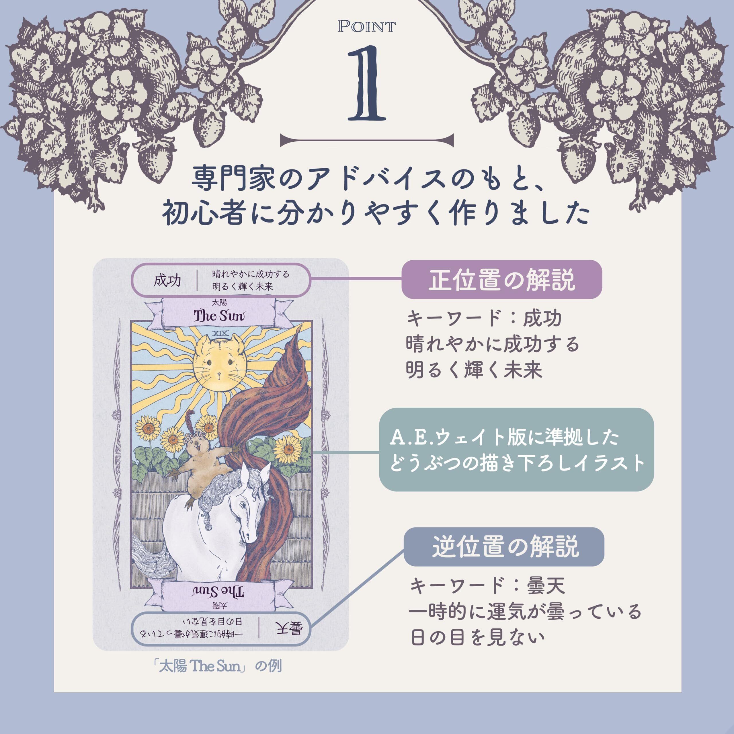 専門家のアドバイスのもと、初心者に分かりやすく作りました。カードの絵柄に合わせた説明も多数ありますので、絵柄を意識した占いをしやすいです。
