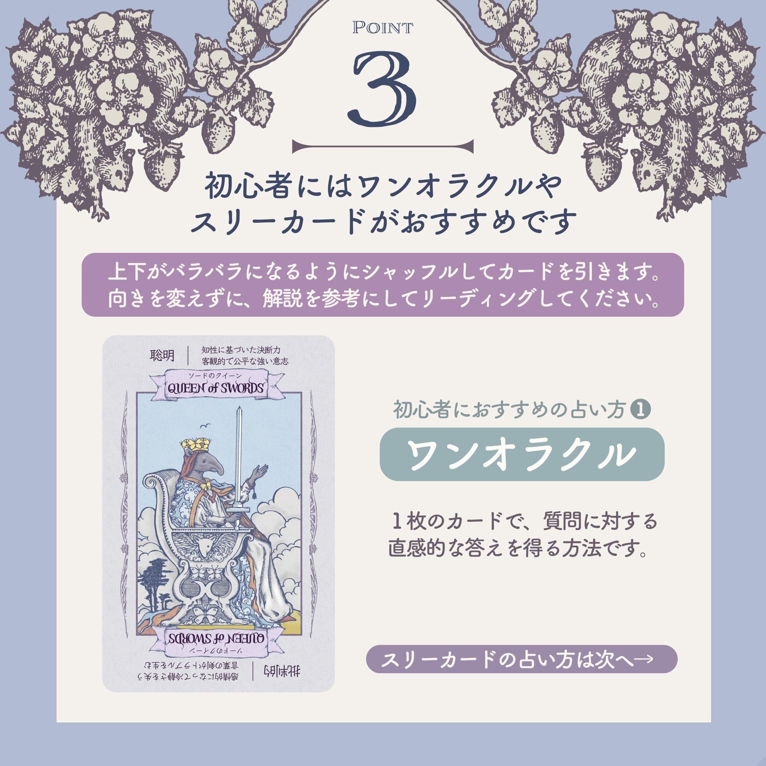 全く知識がない状態でも、占いたいことを思い浮かべて、シャッフルして1枚引くだけで占うことができます。