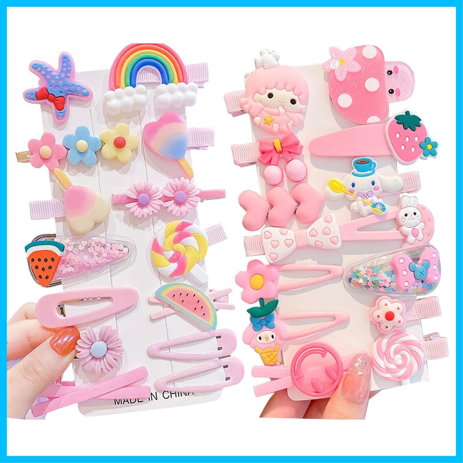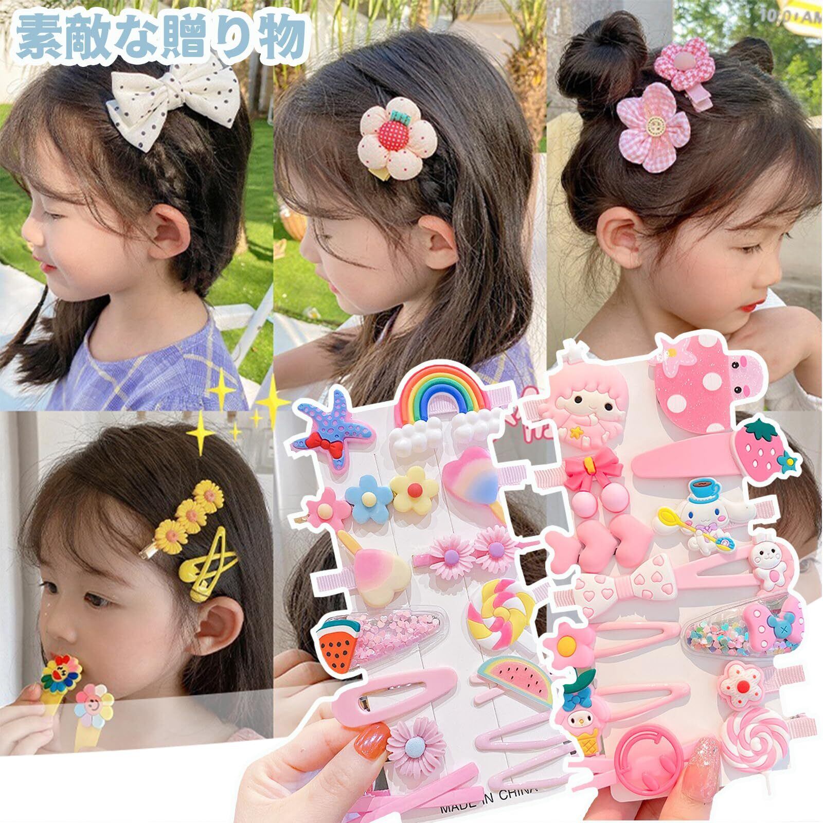 【28点の豪華ヘアゴムセット】- 虹、ウサギ、フラワーズ、蝶結び、ハート、雲など様々なデザインの28点がセットになったヘアピンです。お子様のお気に入りのヘアアクセサリーを幅広く提供し、好きなデザインを選ぶ楽しさを提供します。