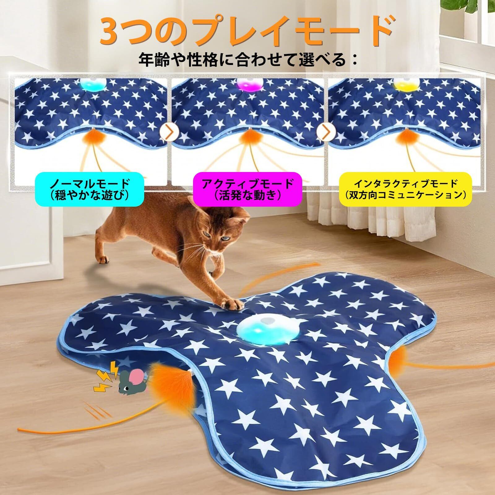 【猫運動不足解消グッズ】 子猫から成猫まで対応する3動作モードを搭載:通常速度(青)は猫 おもちゃ 電動の入門に、活発モード(紫)は運動不足解消に最適。猫が触れると動きが変化するインタラクティブモード(黄)で双方向遊びを実現。