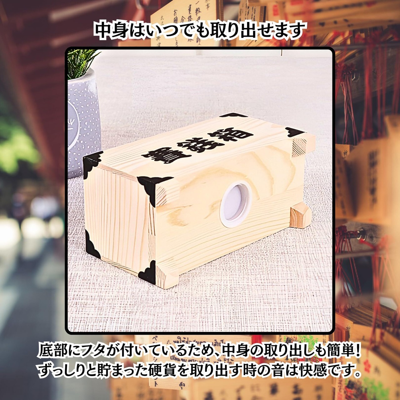 【紙幣も投入可能】投入口は賽銭箱そのままのスリット加工となっておりますので、硬貨だけではなく紙幣も入れられます!底部にフタが付いており、中身の取り出しも簡単です。