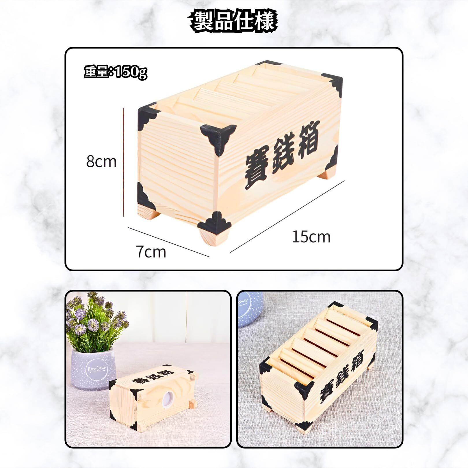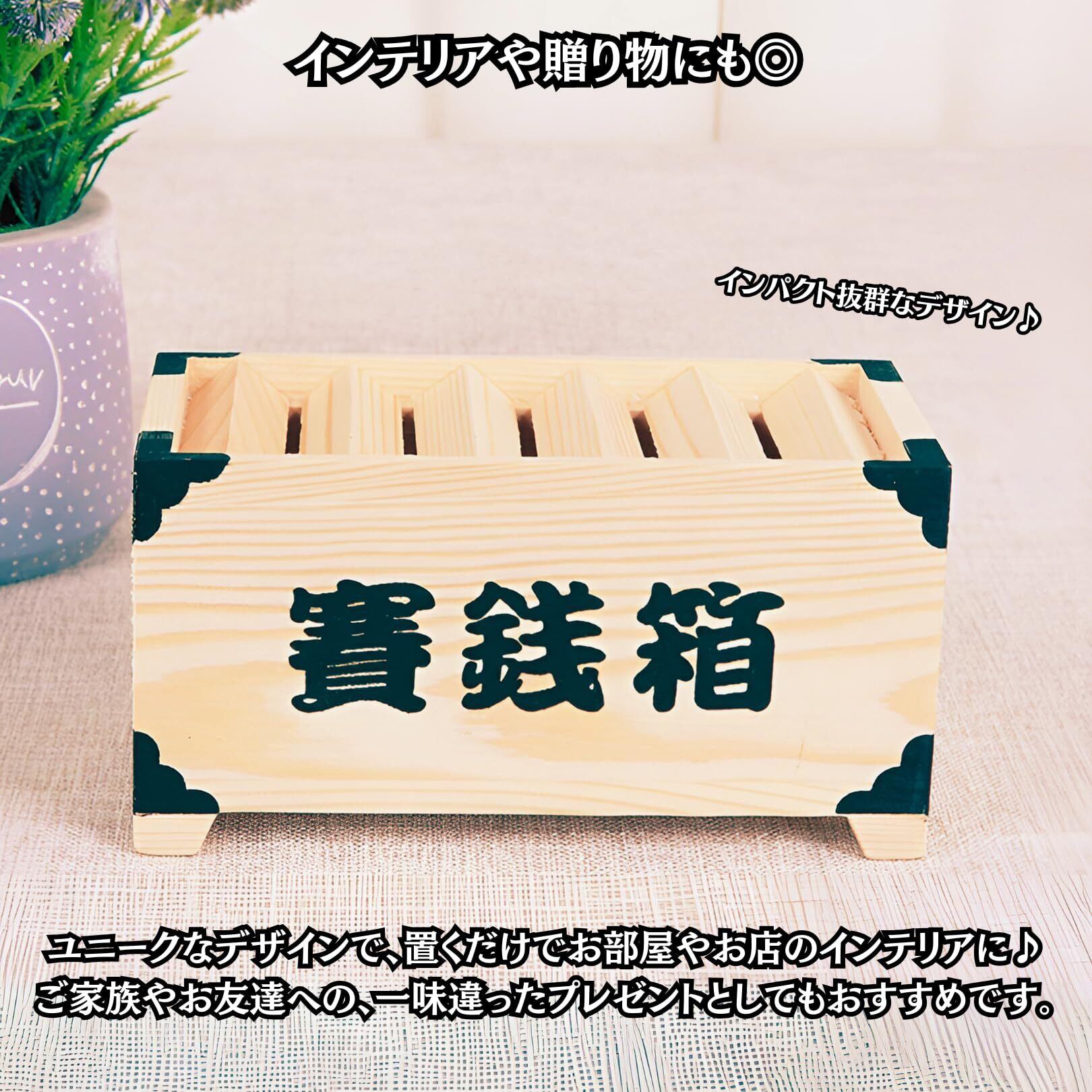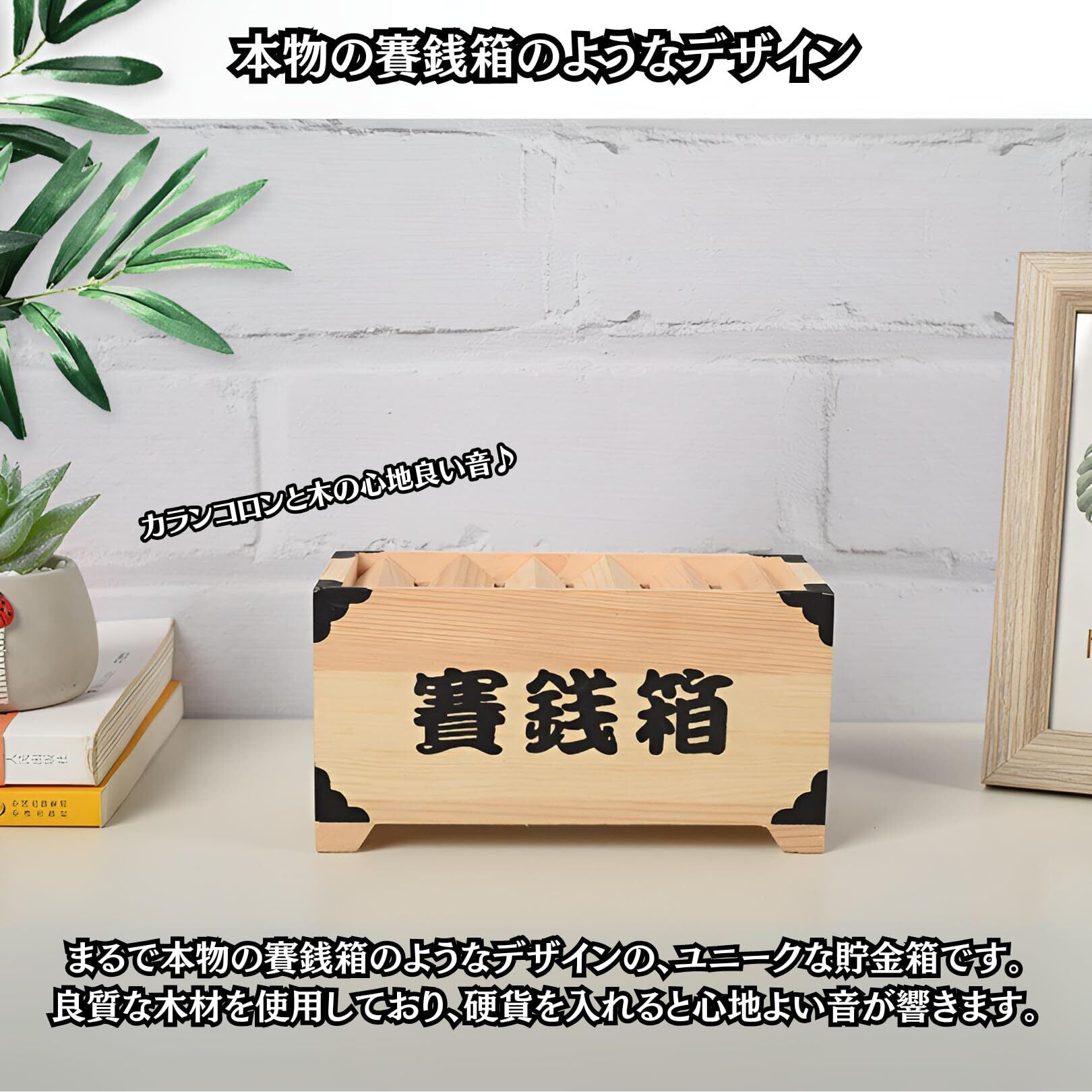 【本物の賽銭箱のようなデザイン】まるで本物の賽銭箱のようなデザインの、ユニークな貯金箱です。良質な木材を使用しており、硬貨を入れると独特の心地よい音が響きます。御利益で運気もアップするかも!?