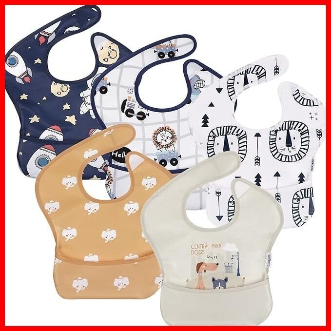 食事エプロン 離乳食 保育園 5点セット ベビー 子供 汚れ防止 フリーサイズ 防水 洗濯機可能 調節可能 BPAとフタル酸塩なし 旅行に最適 防水お食事