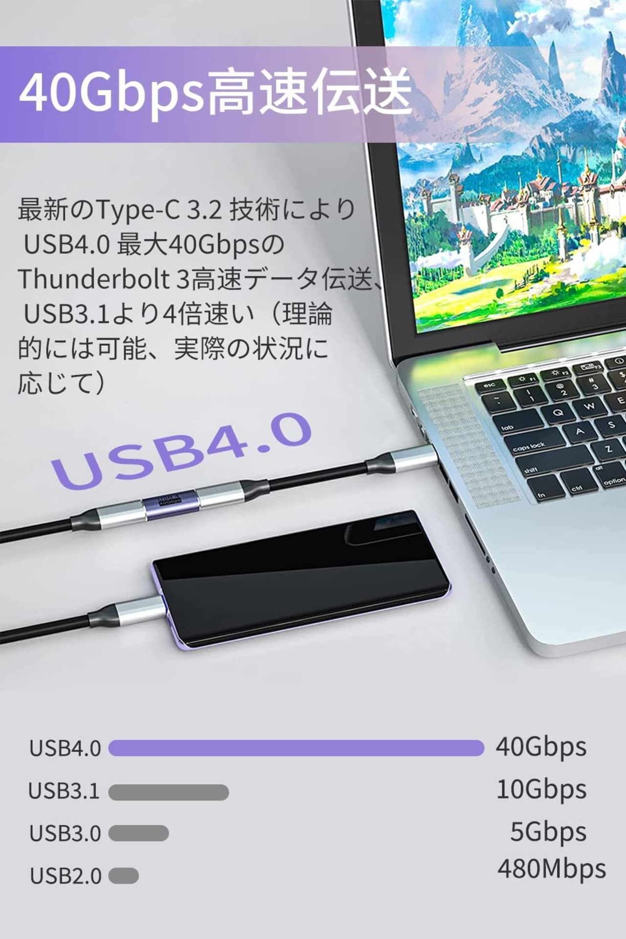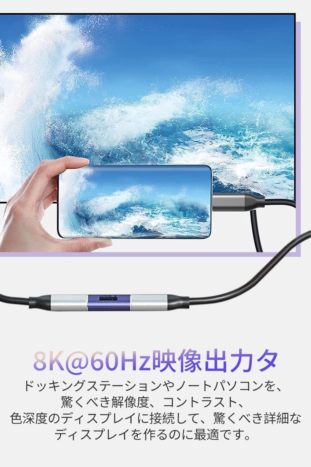 2.【40Gbps高速伝送&5A高速充電】最新のType-C 3.2 技術により USB4.0 最大40GbpsのThunderbolt 4高速データ伝送(実際の転送速度は2.8GB/s実現と2.1GB/s書き込み)。このは、8K@60Hzまたは4Kディスプレイ2台を駆動するのに十分な帯域幅を有します。ファイル、ドキュメント、オーディオ、ビデオなどを数秒で高速に転送します。最大電流は5Aに達し、最大電力は100Wに達する可能性があります。注:1、40Gbpsは理論上の最大伝送速度です。実際の速度は、PC端末やケーブルなどの影響を受けので、実際の伝送速度を参照してください。