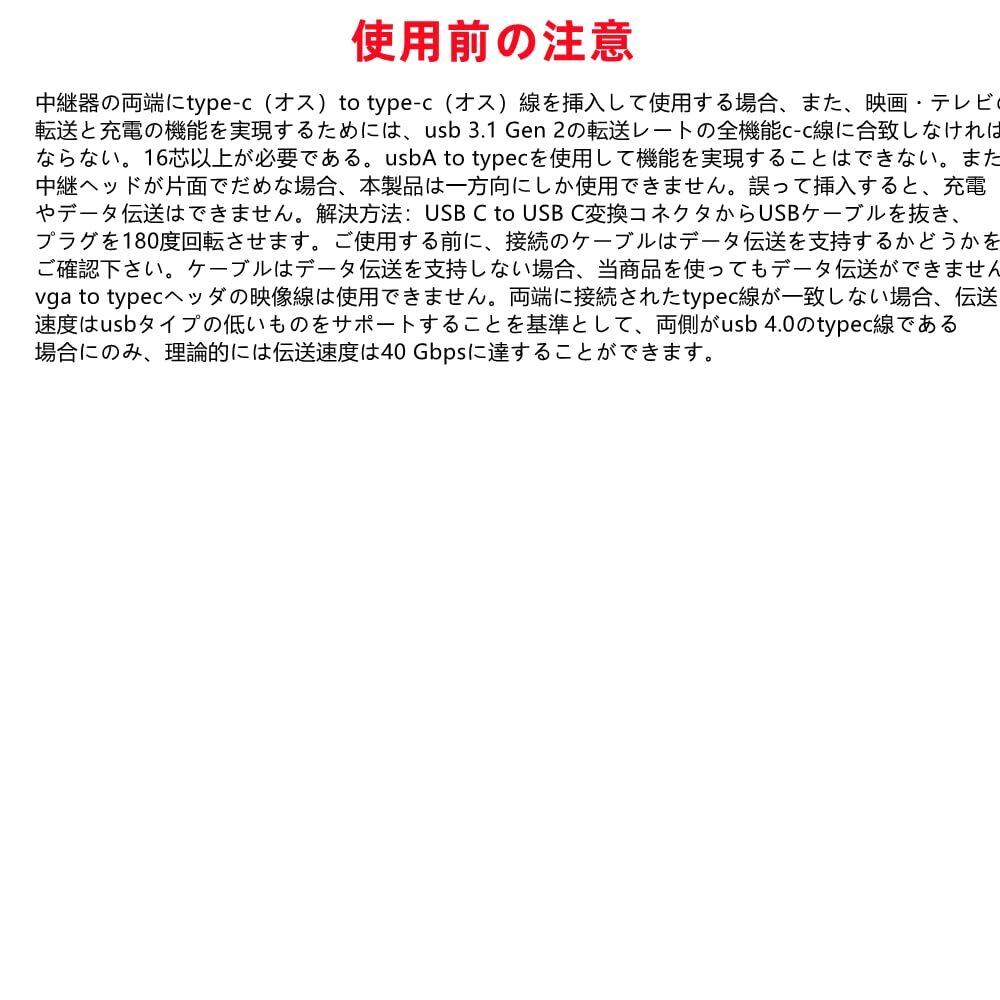 3.【使用ご注意】中継器の両端にtype-c(オス)to type-c(オス)線を挿入して使用する場合、また、映画・テレビの転送と充電の機能を実現するためには、usb 3.1 Gen 2の転送レートの全機能c-c線に合致しなければならない。16芯以上が必要である。usbA to typecを使用して機能を実現することはできない。また、中継ヘッドが片面でだめな場合、本製品は一方向にしか使用できません。誤って挿入すると、充電やデータ伝送はできません。解決方法:USB C to USB C変換コネクタからUSBケーブルを抜き、プラグを180度回転させます。ご使用する前に、接続のケーブルはデータ伝送を支持するかどうかをご確認下さい。ケーブルはデータ伝送を支持しない場合、当商品を使ってもデータ伝送ができません。vga to typecヘッダの映像線は使用できません。両端に接続されたtypec線が一致しない場合、伝送速度はusbタイプの低いものをサポートすることを基準として、両側がusb 4.0のtypec線である場合にのみ、理論的には伝送速度は40 Gbpsに達することができます。