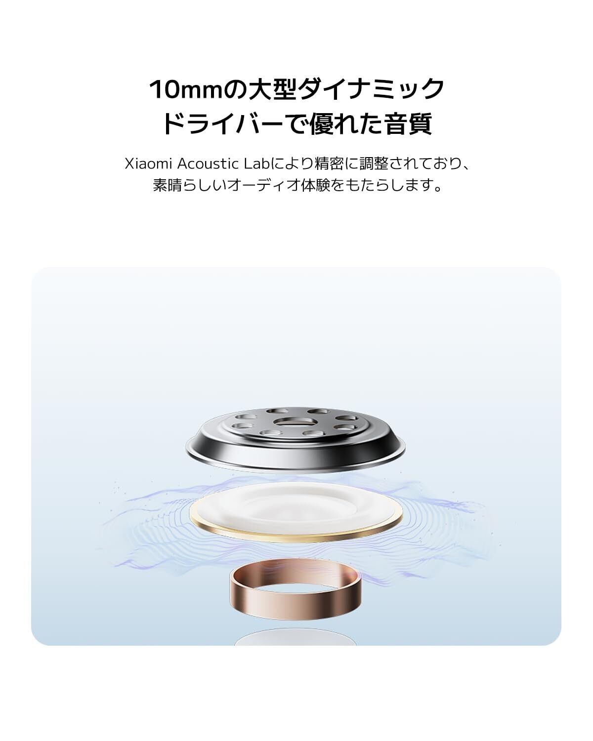【10mmのダイナミックドライバーでパワフルなサウンド】10mmの大型ダイナミックドライバーは、Xiaomi Acoustic Labにより精密にチューニングされており、素晴らしいオーディオ体験をもたらします。そして5種類のプリセットイコライザーにより、豊かでパワフルかつ魅力的なサウンドが細部まで聴こえます。優れた音質を表現しながら、好みに合わせて調整が可能です。