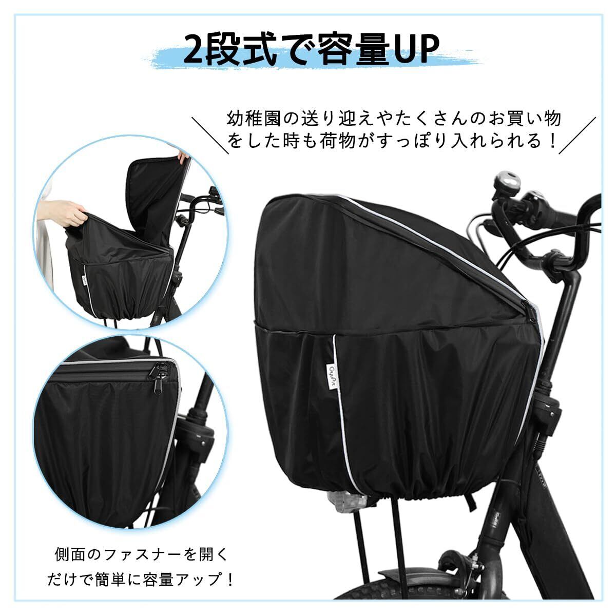 自転車 カゴカバー 防水 前 二段式 容量アップ バスケットカバー 前用 反射帯バイアス 取り外し簡単 撥水 防水加工 210Dナイロン 雨よけ 日よけ GyuPit