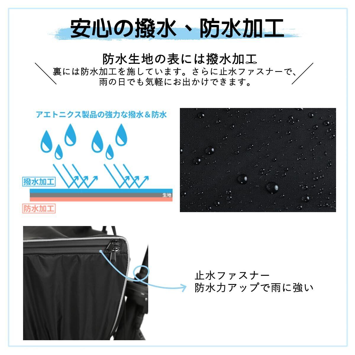 優れた防水・耐水性:表面には撥水加工、裏面には耐水圧加工(2000mm)が施されている防水生地です。水分が生地の内側まで染み込むことがありません。