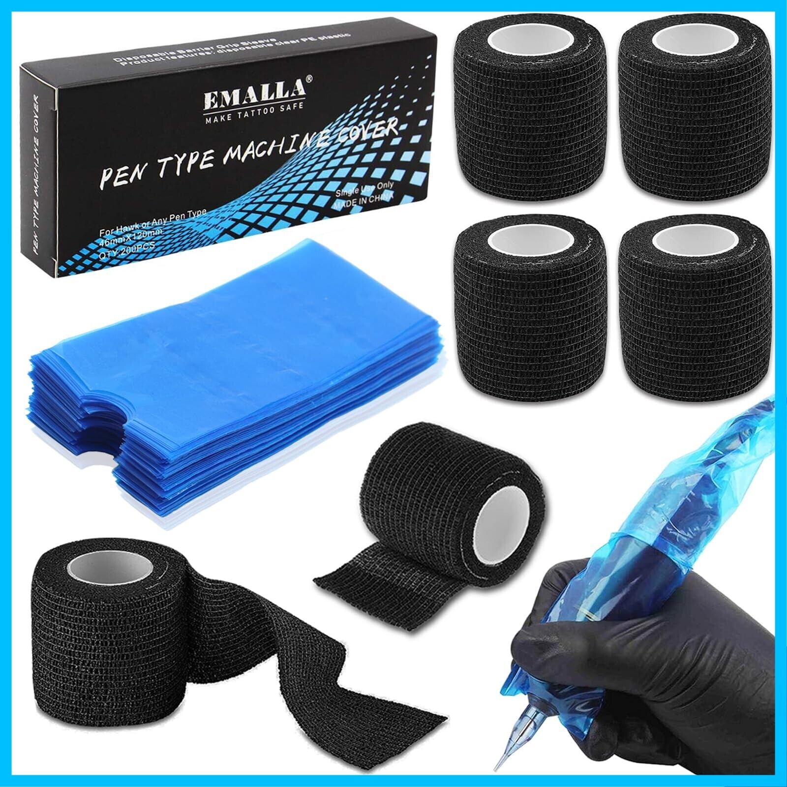 TONBAO タトゥーペンカバー タトゥーグリップテープ付き - 200個のタトゥーペンカバーと4個のタトゥーグリップテープ弾性包帯 ブラック タトゥーグリップカバー タトゥーペンスリーブ コンビネーションタトゥー用品