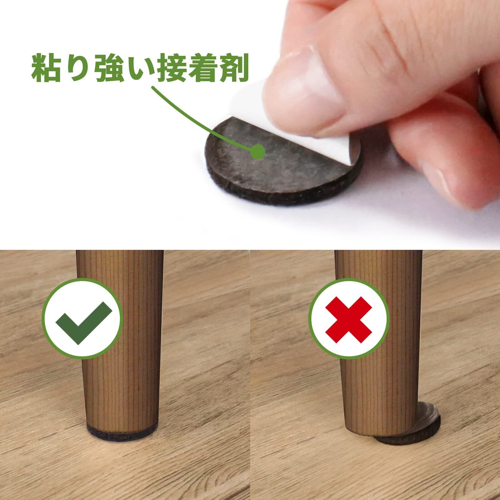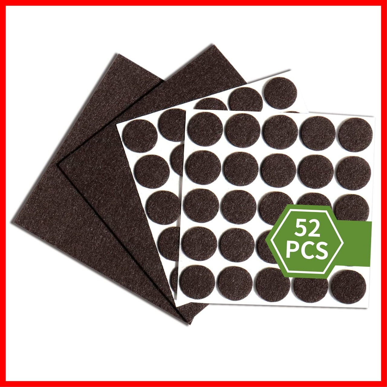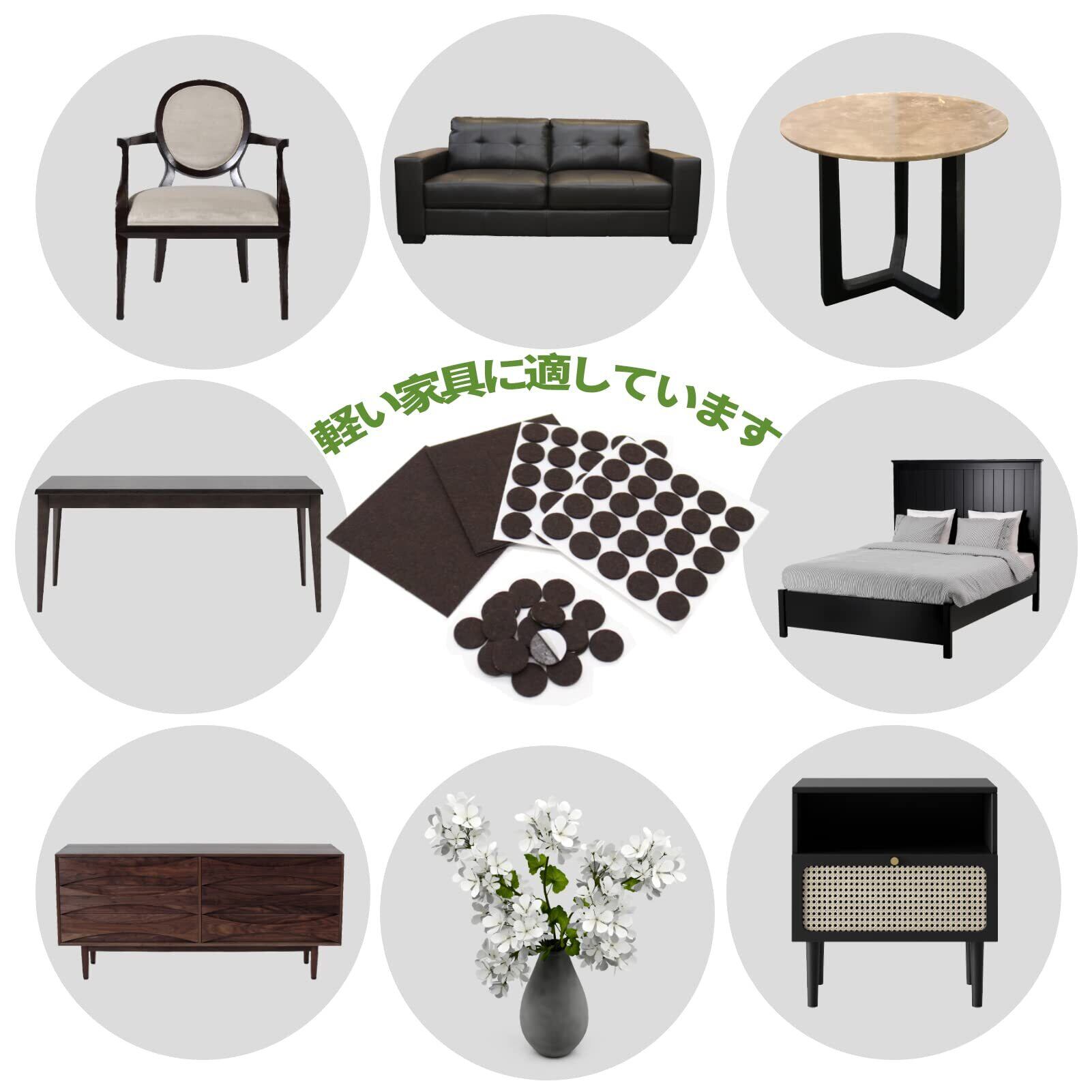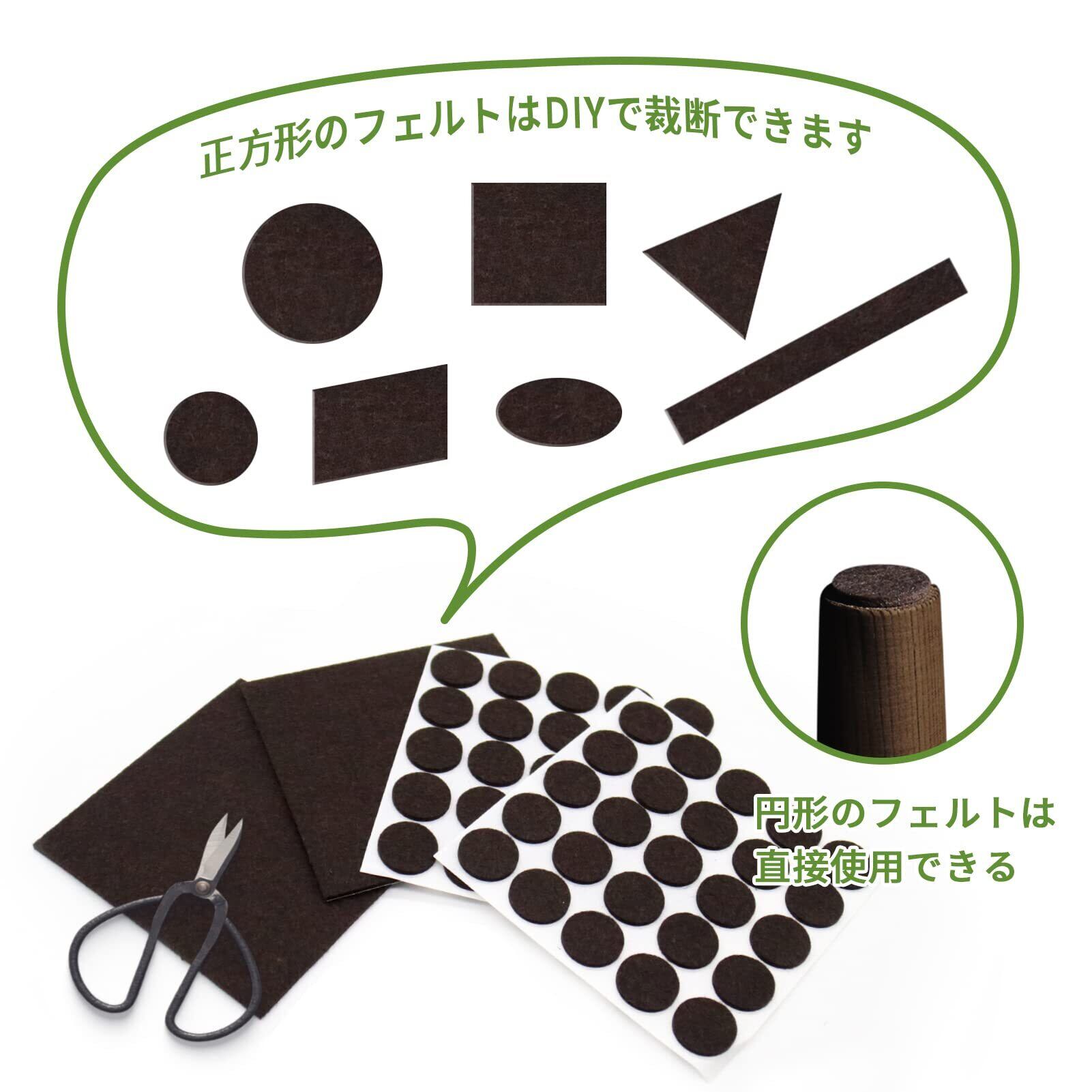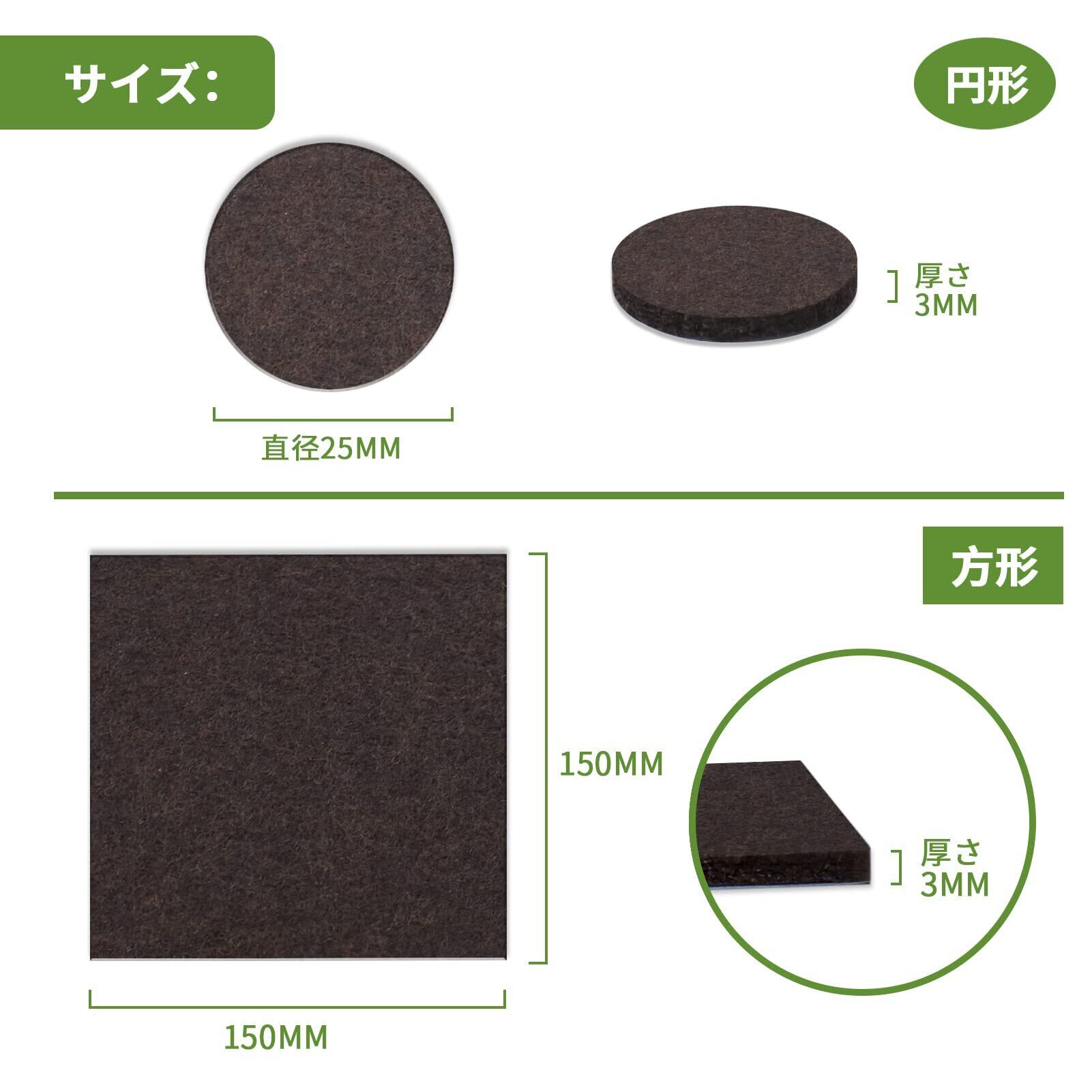 【製品仕様】傷防止テープのフェルトパッドのセットには2種類のサイズがセットになっています。円形(50個)+方形 (2個):直径2.5cm(50枚)+15*15cm(2枚)【合計52枚入り】 厚さ:3mm、色:ダークブラウン、材質:PET。あらゆる家庭用家具に適しています、テーブル、食卓、椅子、戸棚、キュリオ、電子レンジ、机、洗濯機、冷蔵庫、パソコン、植木鉢、電話、ソファ脚、本棚などの家具の後ろ、ドアの後ろ、飾り品の下、電気品などの様々な家具で大活躍です。当社のフローリングプロテクターは、あらゆるタイプの椅子の脚、家具の脚、その他の家庭用家具、電気およびその他のアイテムに最適です。 私たちのフェルトフロアプロテクターをあなたの家の家具やアイテムに貼り付けるのはとても簡単です。