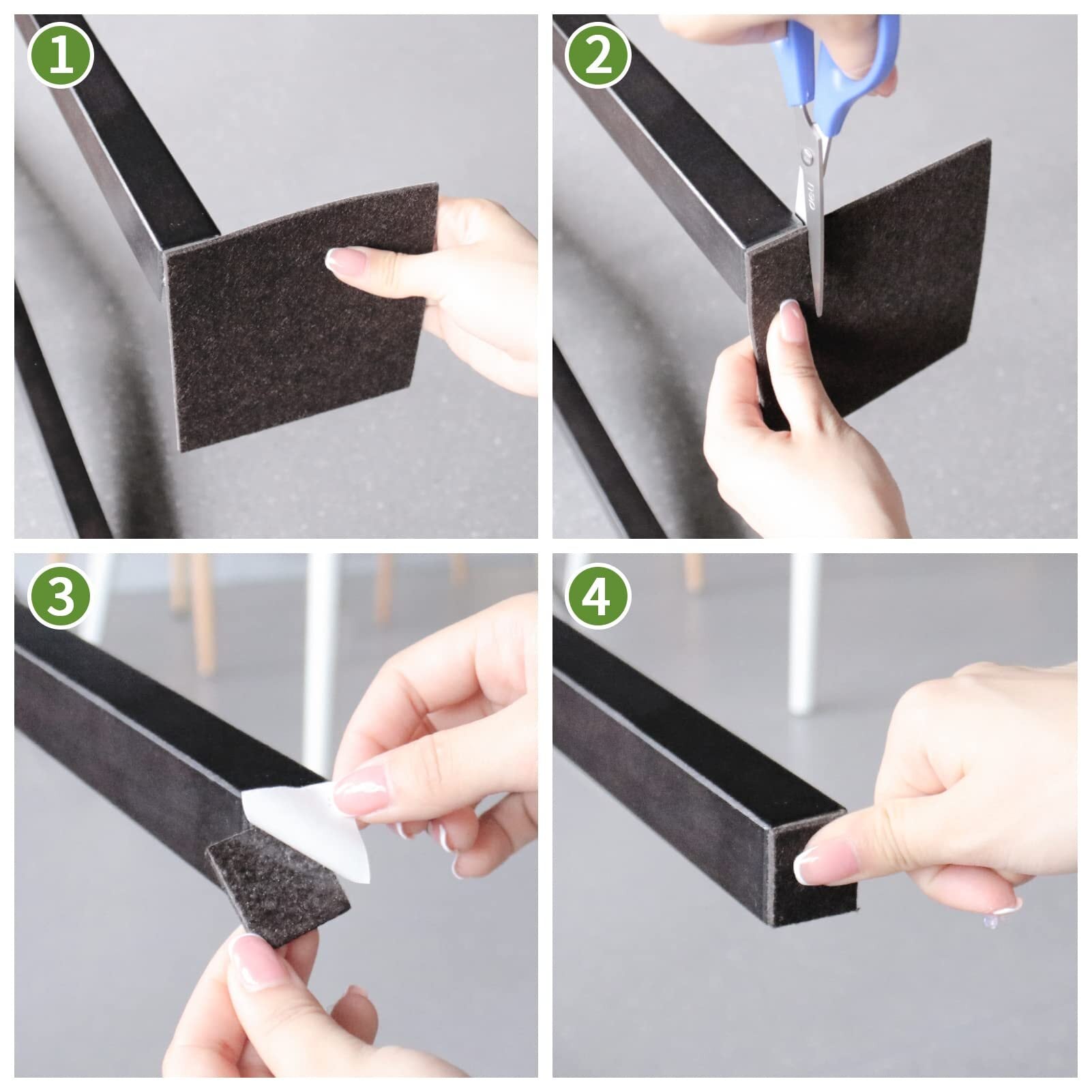 【フリーカット DIY】ハサミで自由にカットできるフリーカットタイプのキズ防止テープ。必要に応じて様々な形状にカットでき、机、イス、テーブルなど家具の足の裏面に貼るだけで使用が極めて簡単。丸型・角型のどちらの脚にも合わせられる人気の家具保護パッドです。