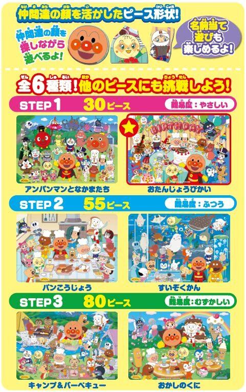 同シリーズでSTEP2:55ピース(パンこうじょう・すいぞくかん)、STEP3:80ピース(キャンプ&バーベキュー・おかしのくに)があります。