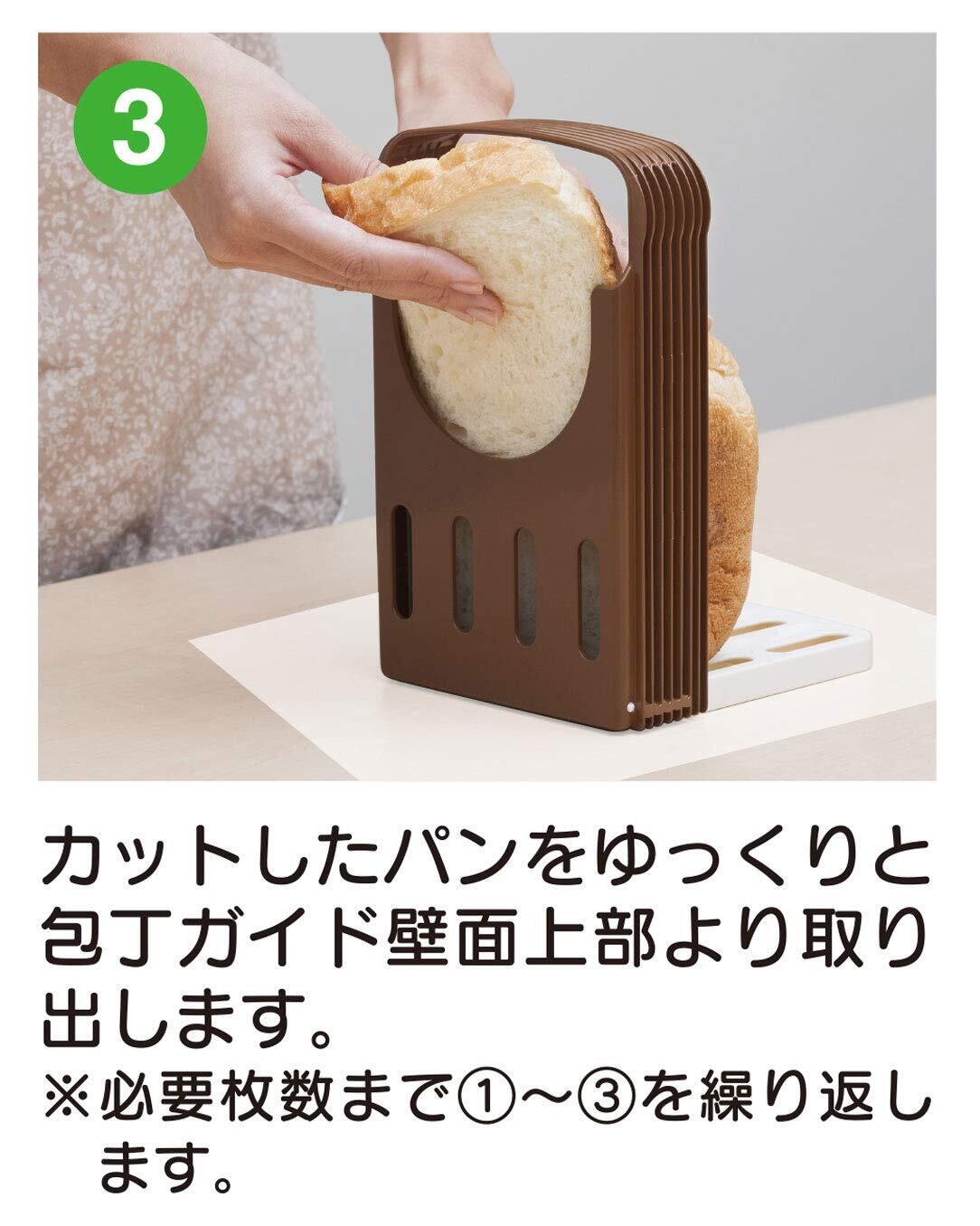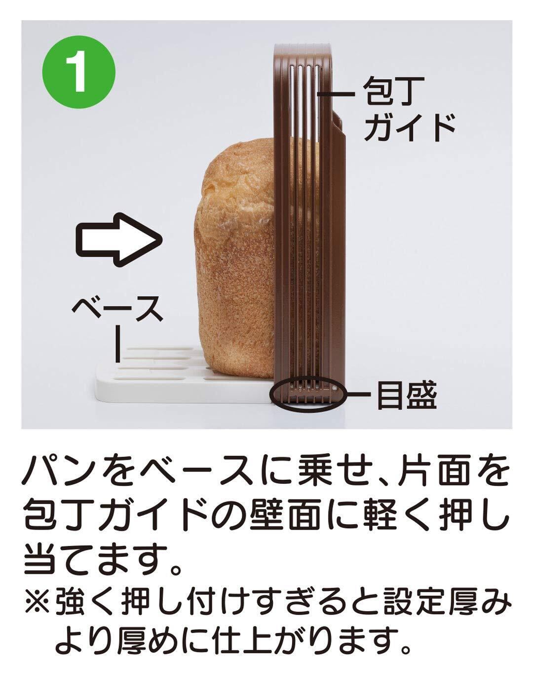 ▼使用方法:1パンを白色のベースに乗せ、片面を包丁ガイドの壁面に軽く押し当てます。 2切りたい厚さの包丁ガイドの溝にパン切り包丁を差し込み、前後に平行に動かしながらゆっくりとカットしていきます。 3カットしたパンをゆっくりと包丁ガイド壁面上部より取り出します。 ※必要枚数まで1~3を繰り返します。