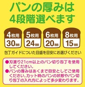 ▼ご使用上の注意:パンを切る前に・・カットガイドが動きにくいよう、濡れふきん等を敷いてご使用下さい。また、パンの厚みはあくまで目安としてご使用下さい。カット時のパンの状態やパン切り包丁の入れ方によって多少変わります。