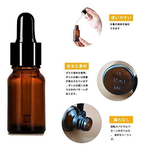 【安全小分けボトル】スポイト瓶10本、容量:10ml、素材:ガラス、ゴム、PP(ポリプロピレン)。香水、エッセンシャルオイル、マッサージオイル、アルコールなどの液体を保存でき、日常使いに便利です。