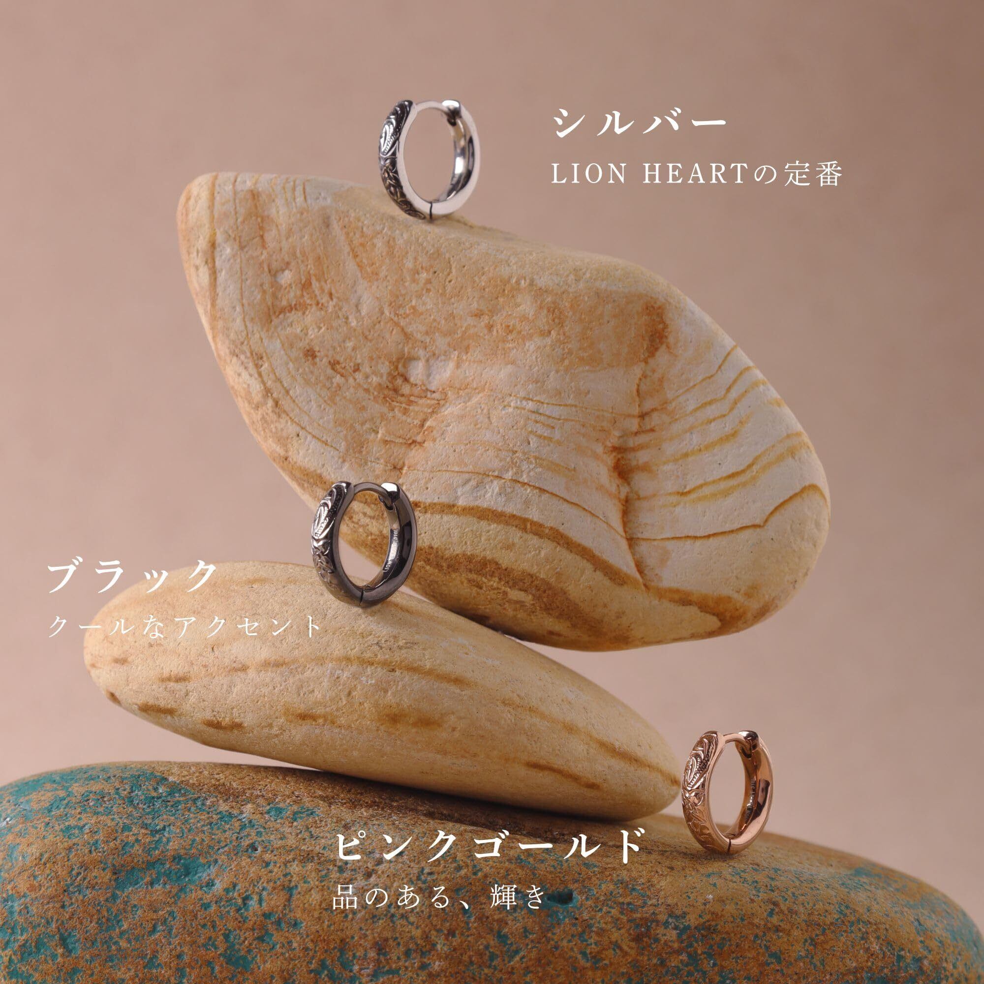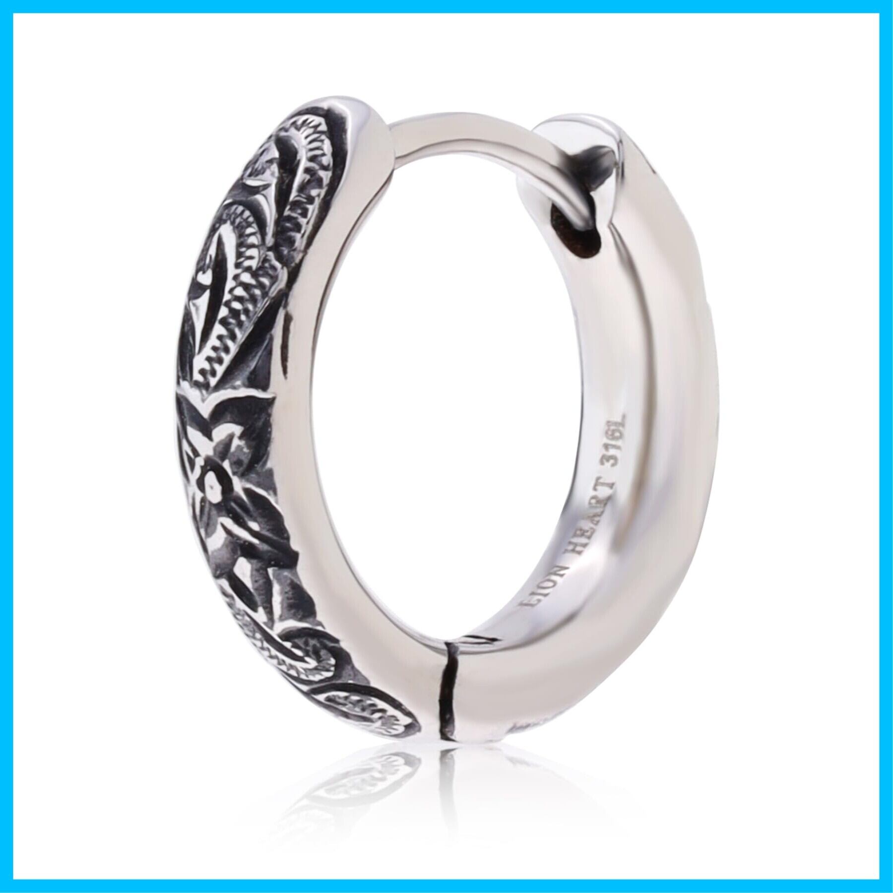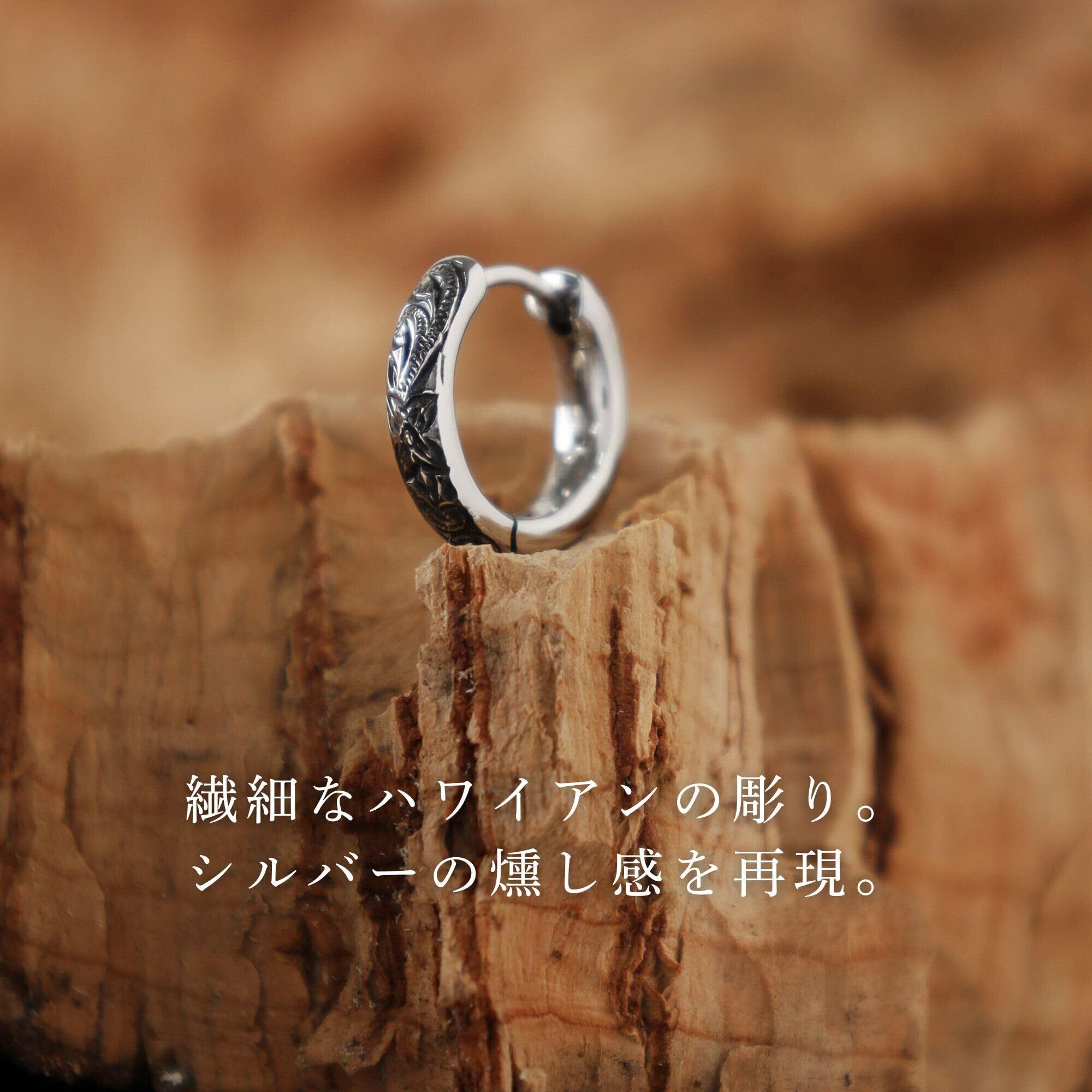 【繊細なハワイアン調の彫りが美しいフープピアス】程よく小ぶりでデイリーユースにピッタリ。彫り部分でシルバー925の燻し感をサージカルステンレス316Lで再現。ライオンハートならではのこだわりです。
