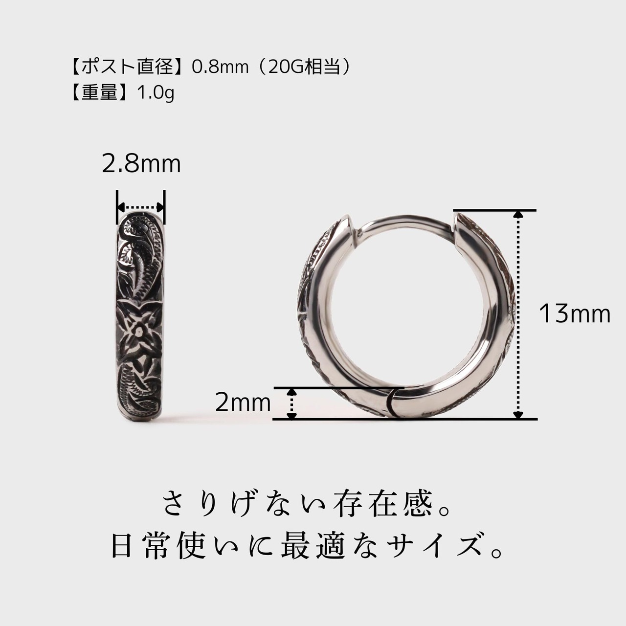 【サイズ】「直径」13mm「厚み」2mm「ポスト直径」0.8mm(20G相当)「重量」1.0g