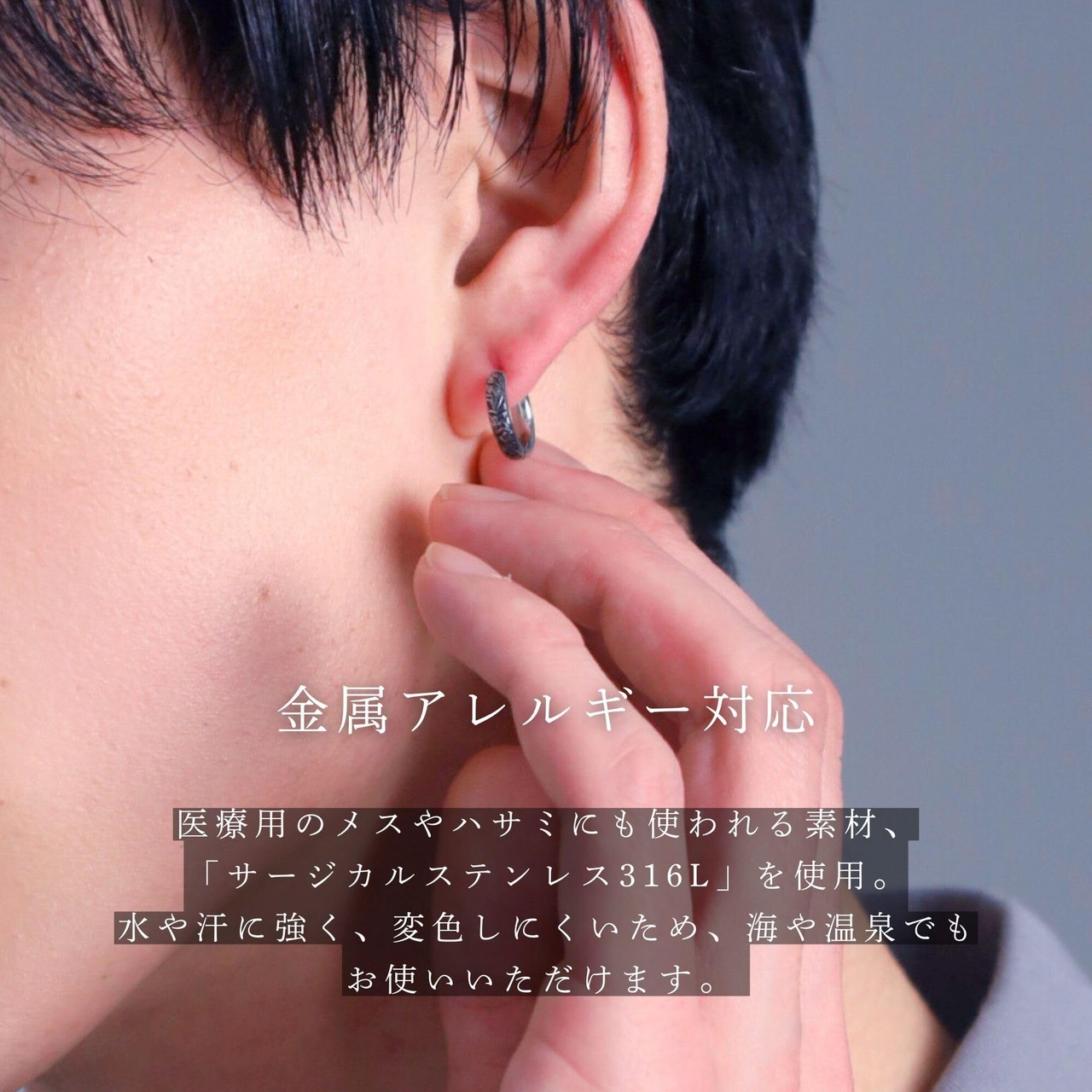 【金属アレルギー対応】サージカルステンレス“316L”を使用。金属アレルギーの方でも使用していただけるので、自分用だけでなくプレゼントとしても安心してお選びいただけます。