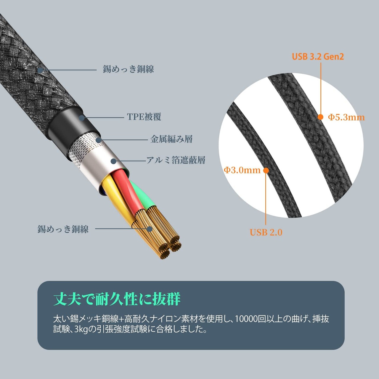 【耐久性に優れた】ケーブルには引っ張りやねじれに強く、さらに絡まりにくさも兼ね備える耐久性の高いナイロン素材を使用しています。10000回以上の折り曲げ試験に合格して、長期間の使用にも耐えられる断線に強い超タフUSB Type-Cケーブルです。コネクタ部分の素材にもこだわっており、機器との抜き差しが簡単におこなえます。