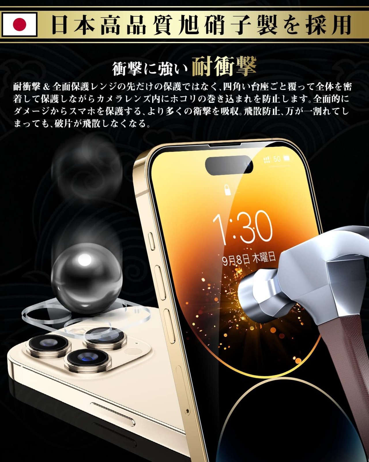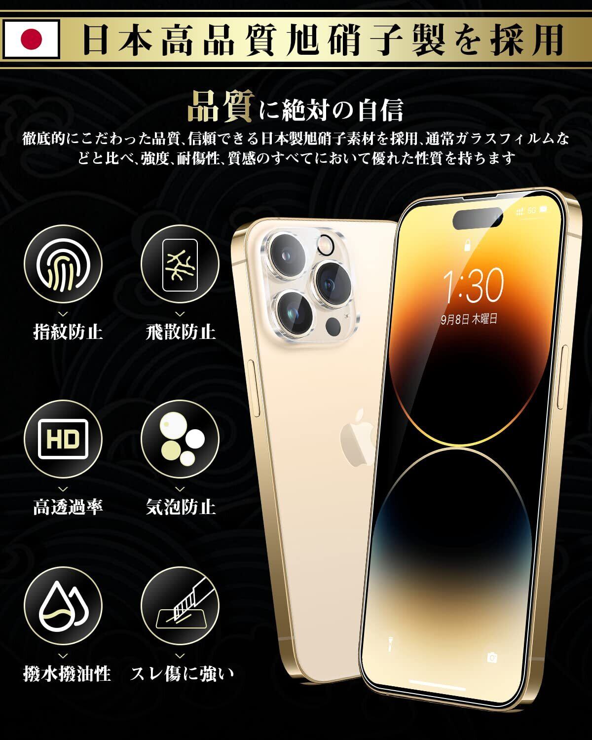 【日本旭硝子素材採用!安全安心・飛散防止設計!】 国産ガラス採用、日本旭硝子社製ガラス素材を使用します。9Hの表面硬度を誇る保護フィルムが摩擦や傷から液晶ガラスをしっかり保護します。通常のPETフィルムより6倍の強度、鍵やカッターなどの鋭利な物を当てても損傷なく使用する事が可能。万が一強力な衝撃でガラスフィルムが割れてしまっても、破片の飛び散りを防ぐ飛散防止コート処理で、画面をしっかり保護、スマホ本体と共に手の怪我の心配もありません。日常生活では、スマホを落としたり衝撃を受けたりした時に、保護フィルムがあれば、画面やレンズの破損を気にすることなく、とてもしっかりと保護することができますよね!