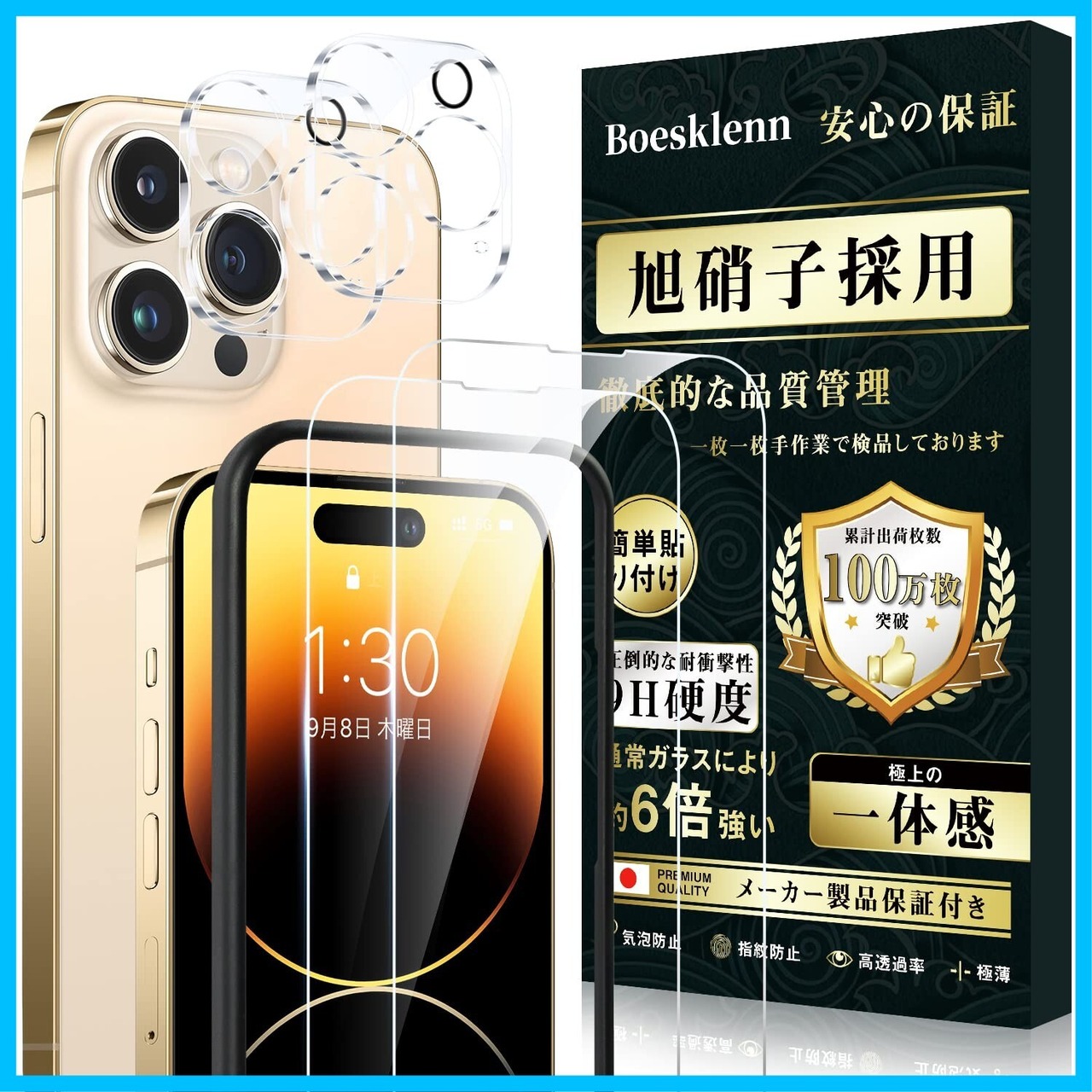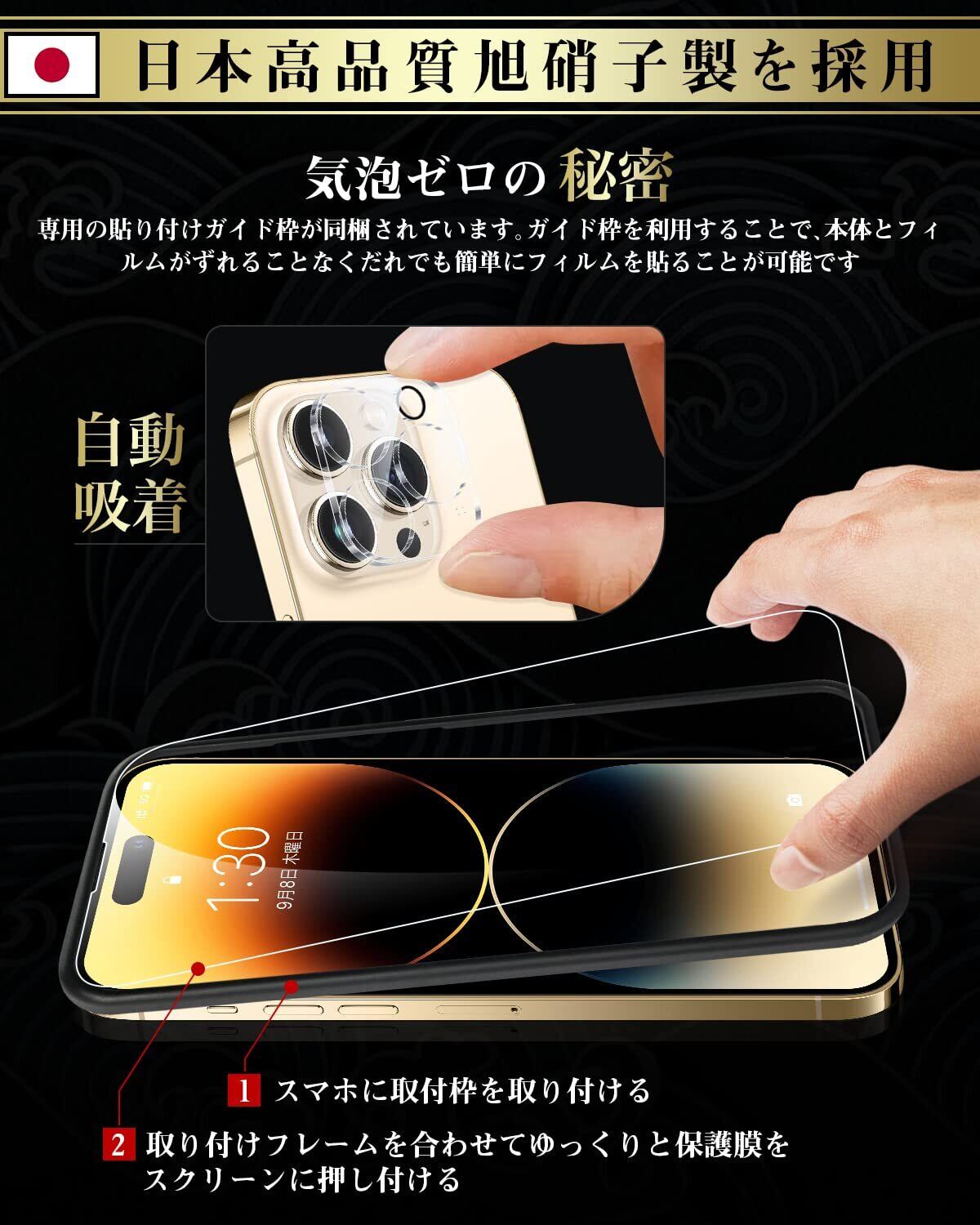 Boesklenn 対応 iPhone14 Pro ガラスフィルム (2枚)+カメラフィルム(2枚) 硬度9H 99%高透過率 飛散防止 自动吸着 撥水撥油 アイフォン14Pro 用 レンズフィルム+フィルム+ガイド枠- 6.1''