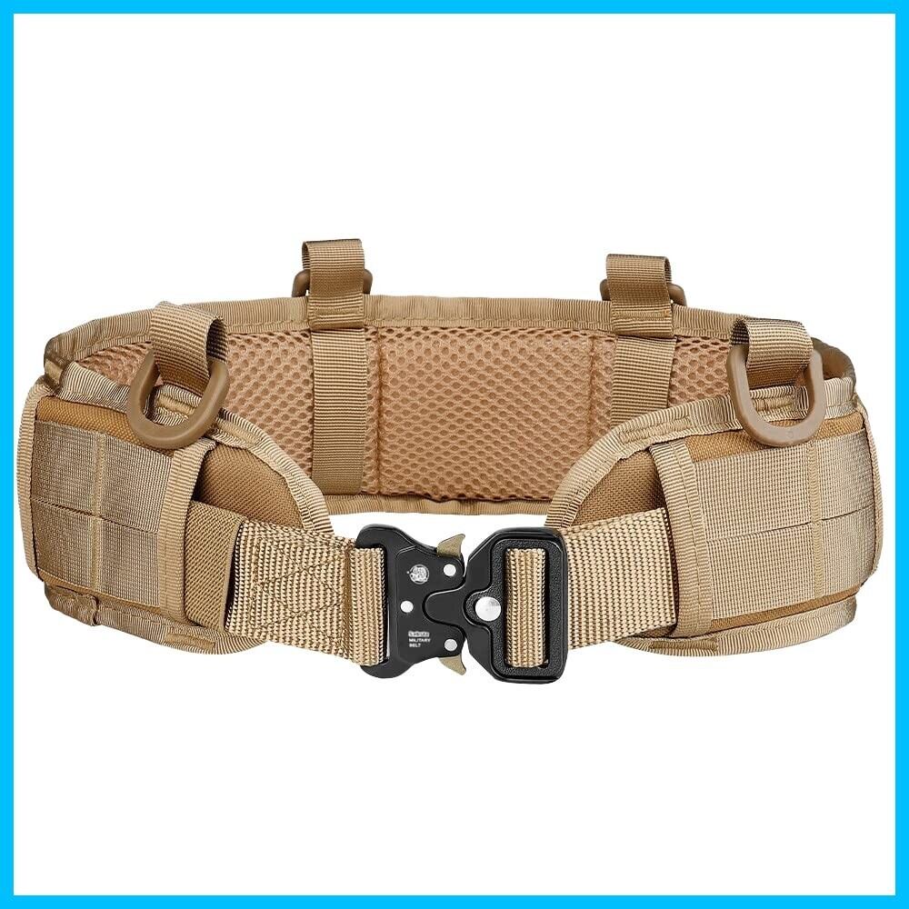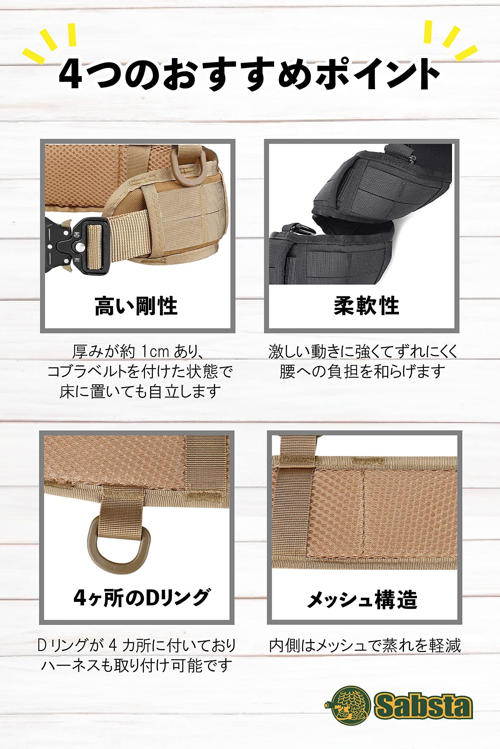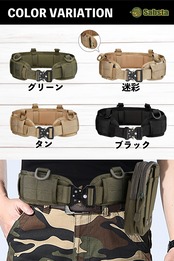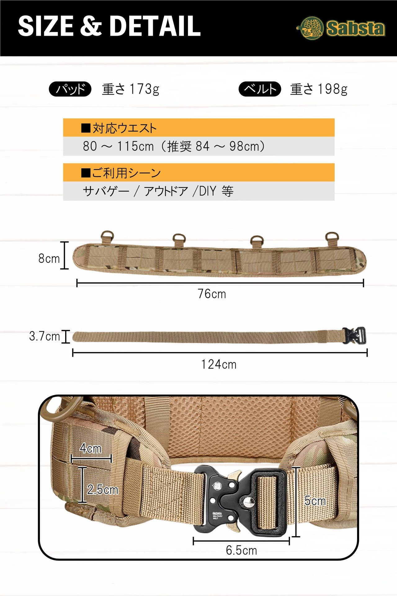 【 高耐久・耐摩耗性・柔軟性抜群 】 MOLLEベルトパッドは厚みが約1cmあり、コブラベルトを付けた状態で床に置いても自立するほどの剛性があります。また柔軟性もあり激しい動きに強く腰への負担を和らげます。内側はメッシュで蒸れを軽減。Dリングが4カ所に付いており、ハーネスも取り付け可能です。 【 様々な場面で活躍 】 サバイバルゲームは勿論のこと、登山やキャンプ、釣り、サイクリング、作業時など様々な場面でご使用が可能です。 【 セット内容 】 タクティカルベルト、モールベルトの2点セット 【 サイズ・重量 】タクティカルベルト(124㎝×3.7㎝ 198g)、モールベルト(76㎝×8㎝ 173g)