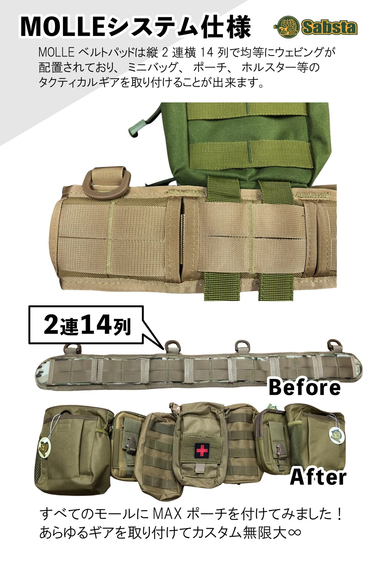 【 カスタム自由なモールシステムパッド 】 MOLLEベルトパッドは縦2連横14列で均等にウェビングが配置されており、ミニバッグ、ポーチ、ホルスター等のタクティカルギアを取り付けることが出来ます。ファーストラインを揃えるには必須アイテムです!