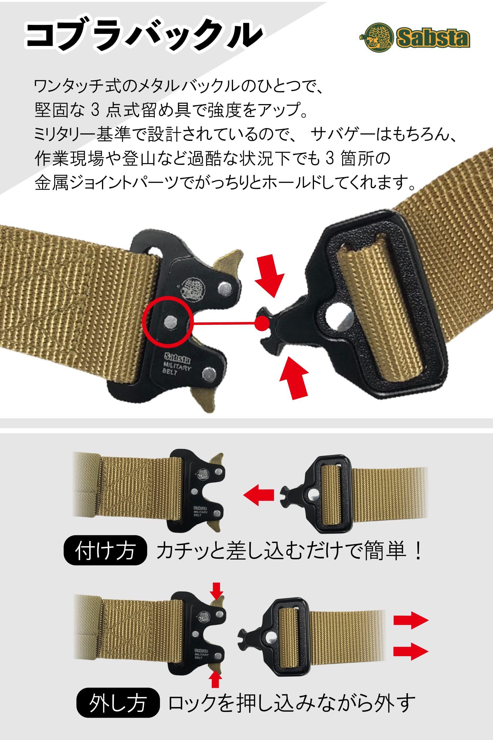 【 コブラバックルベルト 】 ワンタッチ式のコブラバックルを採用。堅固な3点式留め具で強度をアップされます。ミリタリー基準で設計されているので、サバゲーはもちろん、作業現場や登山など過酷な状況下でも3箇所の金属ジョイントパーツでがっちりとホールドしてくれます。また、ベルトはパッドから取り外し可能です。