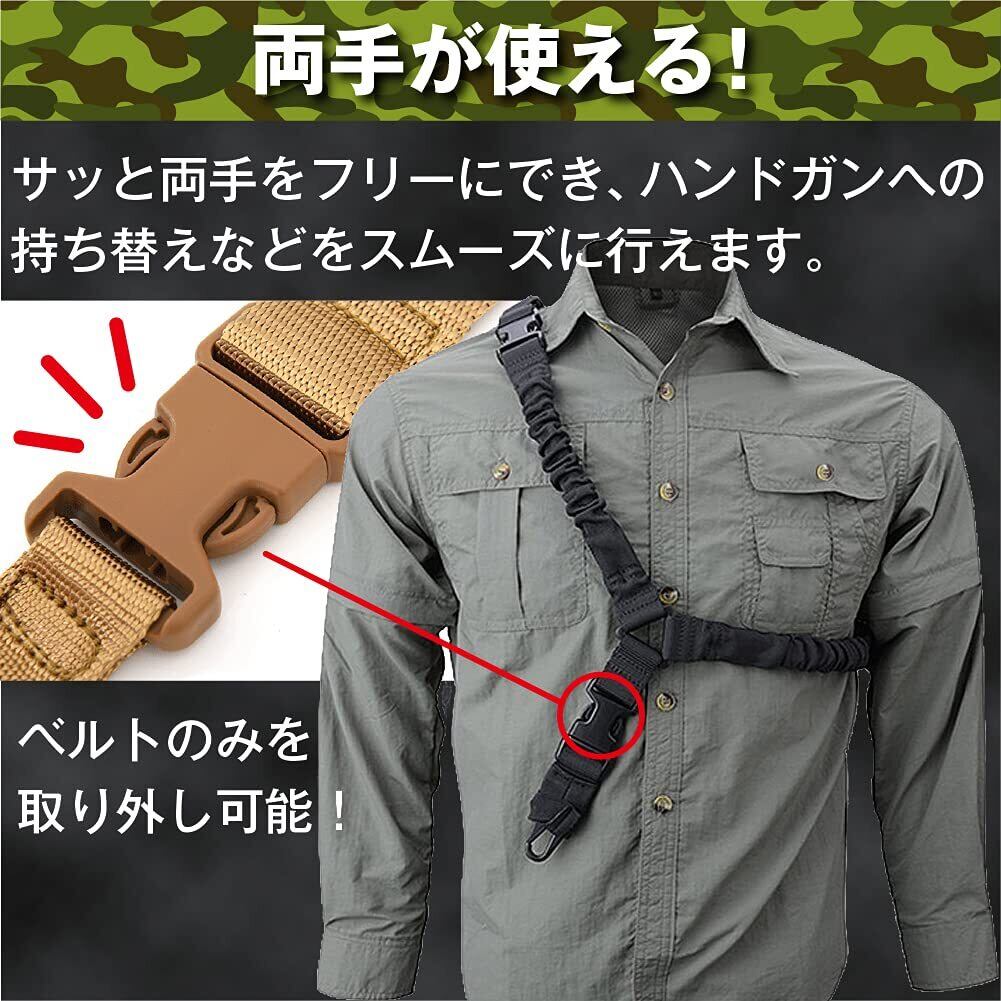 【1点支持で両手が使える!】1点支持スリングで、必要に応じさっと両手をフリーにすることができます。ハンドガンへの持ち替えなどをスムーズに行えます。本体に取り付けた状態で、ベルトのみを取り外すこともできます。