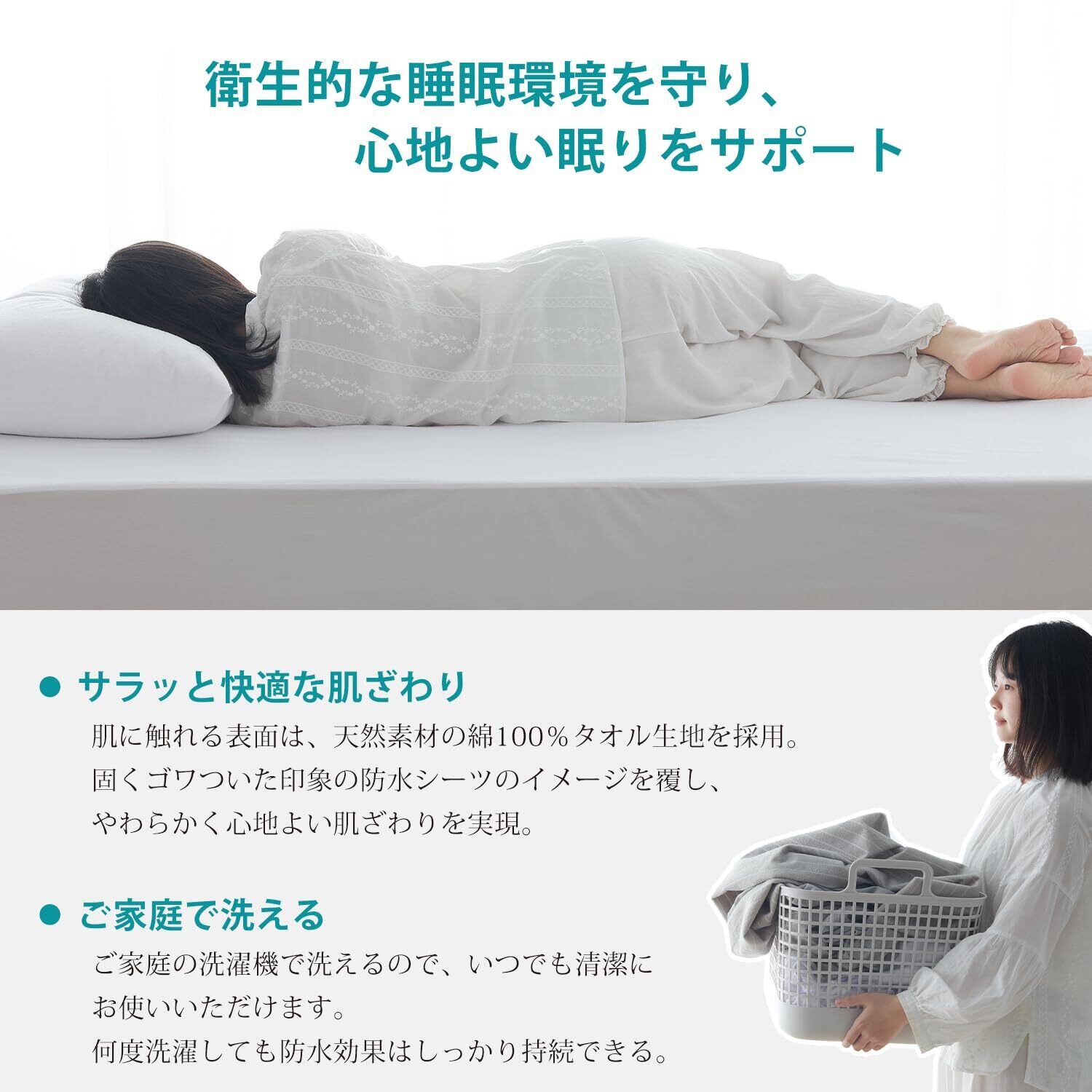 性能:しっかり防水!防水加工を施したシーツが水分の浸透を防ぎ、布団やマットレスをしっかりガード。漏れやムレによる不快感を軽減し、快適な使用感を保ちます。こまめに洗い替えすることで、いつでも清潔で衛生的にお使いいただけます。