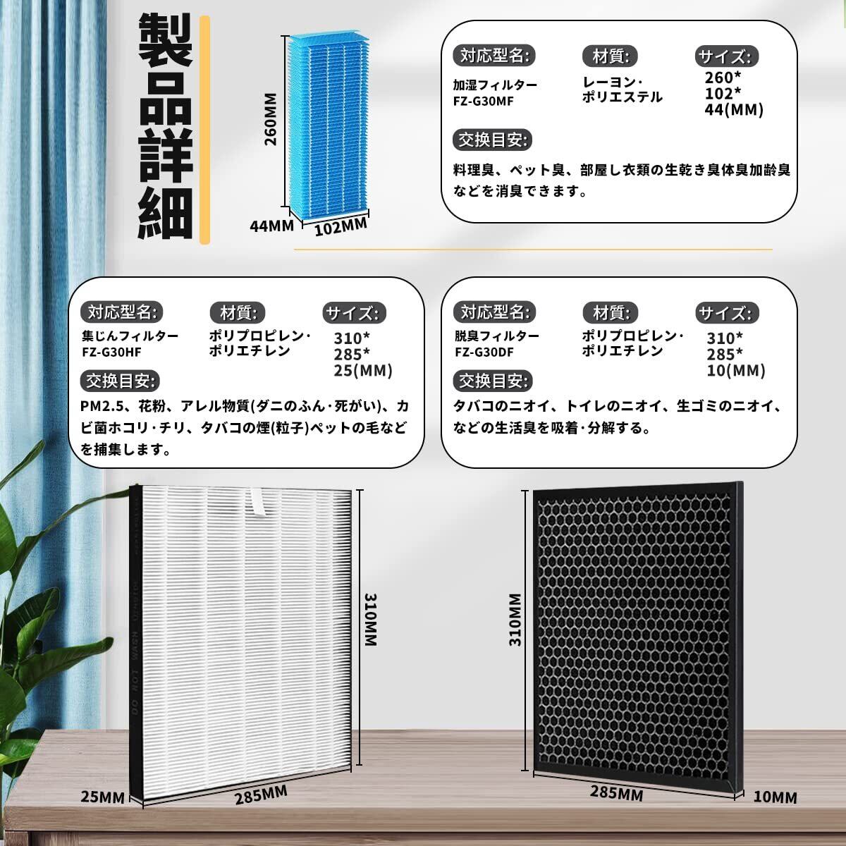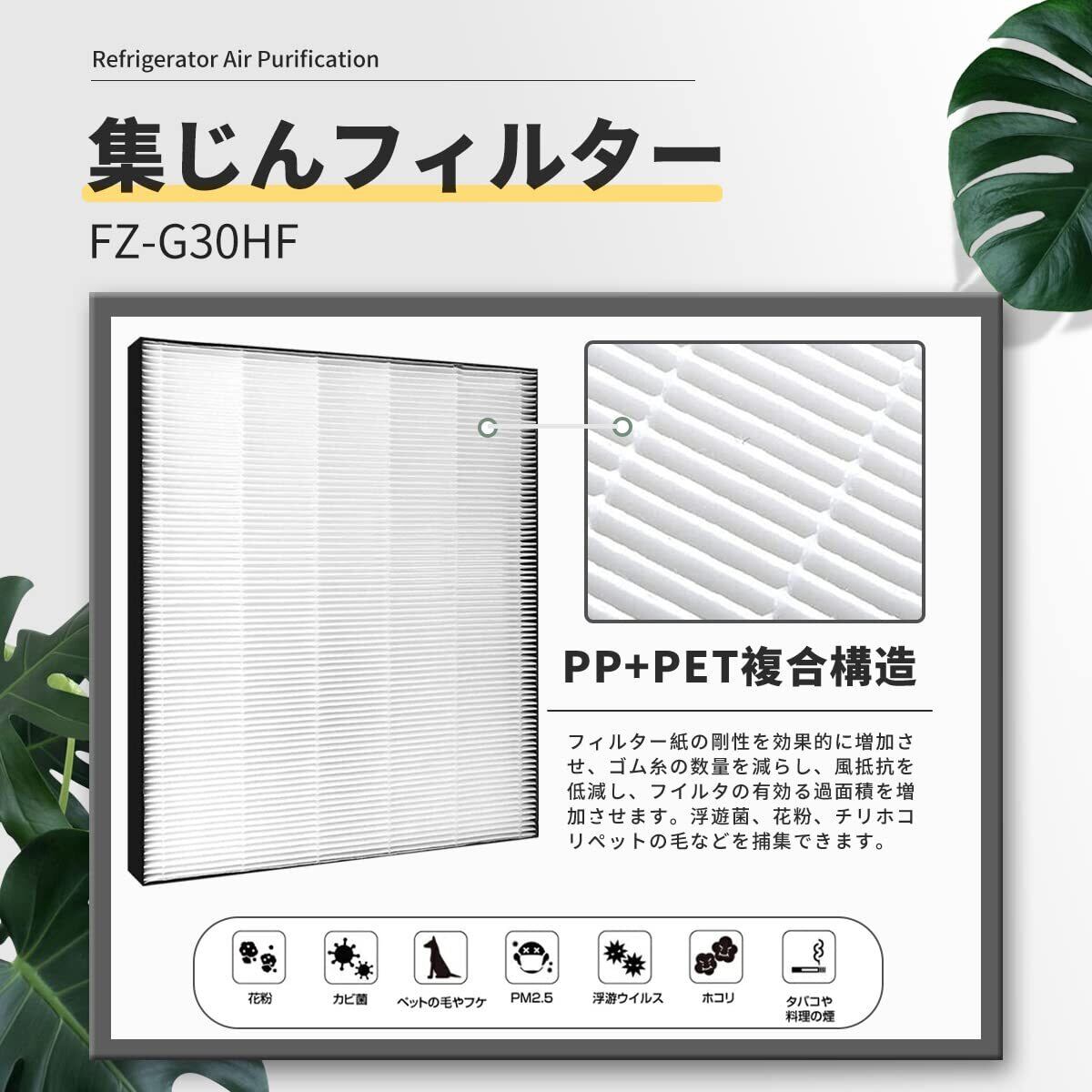 【形名】集じんフィルター: FZ-G30HF 、活性炭フィルター: FZ-G30DF / FZ-H30DF 、加湿フィルター: FZ-G30MF 。材質:ポリプロピレン・ポリエステル・PET・活性炭・レーヨン・ポリエステル。