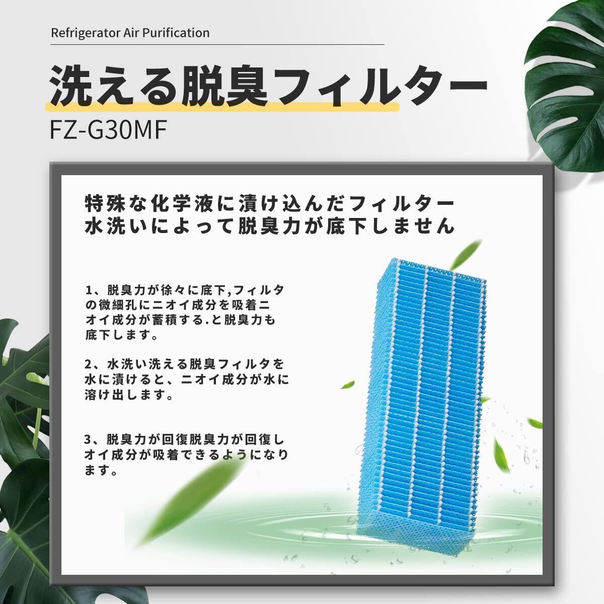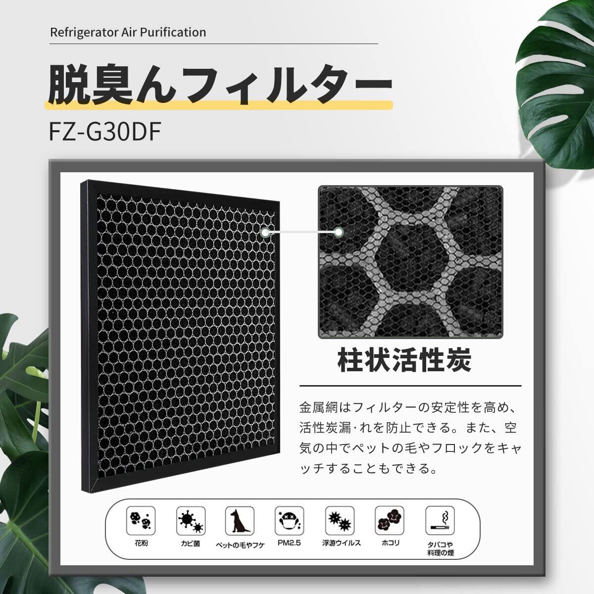 【機能】FZ-G30HFはPM2.5、花粉、アレル物質(ダニのふん・死がい)、カビ菌、ホコリ・チリ、タバコの煙(粒子)、ペットの毛などを捕集する。FZ-G30DFはタバコの煙(ニオイ)、トイレのニオイ、生ゴミのニオイ、ペットのニオイなどの生活臭を吸着・分解する。FZ-G30MFは給水トレーから水を吸い上げ、気化させることで、通過した空気を加湿する。